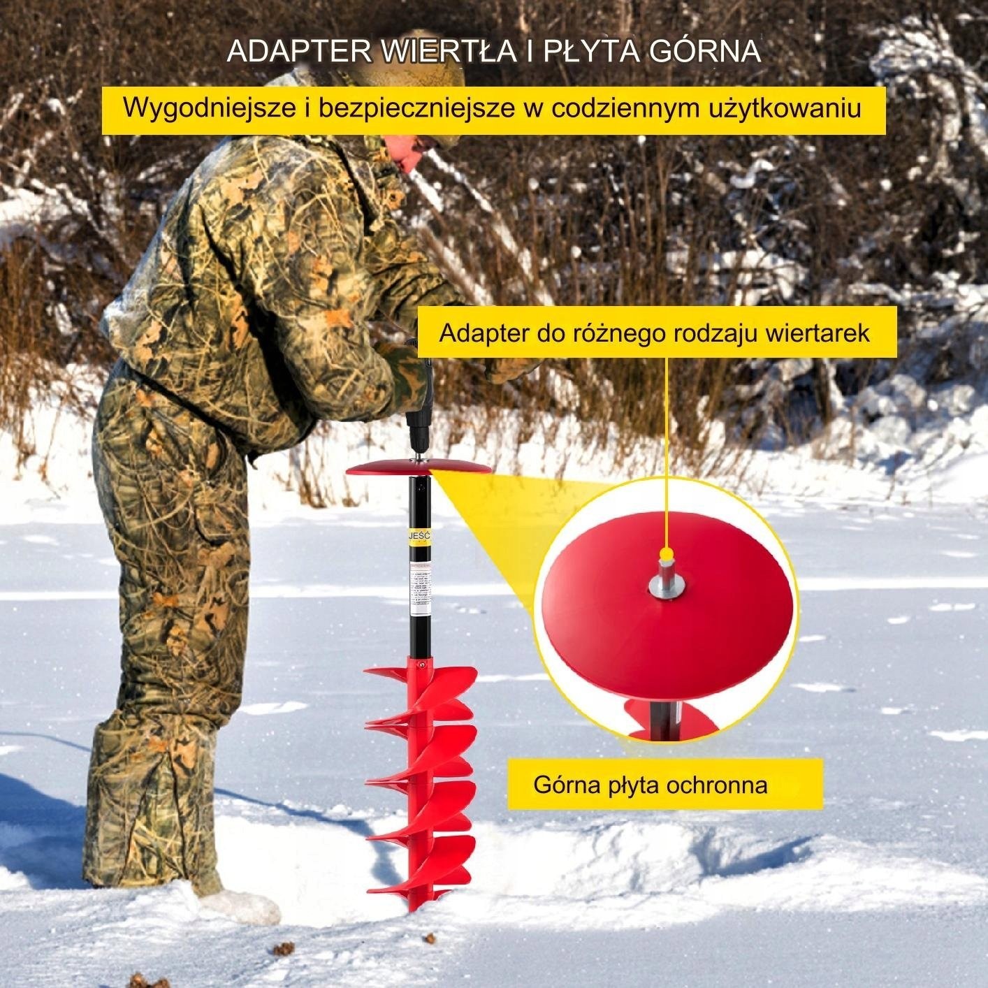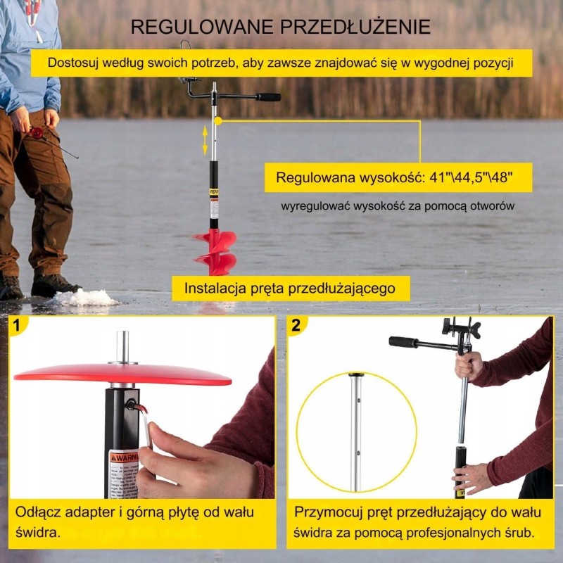 Wenn Sie die Länge des Eisbohrers verlängern möchten, können Sie den Adapter und die Kopfplatte vom Schaft abnehmen und dann die Verlängerungsstange am Schaft befestigen; sichern Sie diese schließlich mit einer Spezialschraube. Einstellbare Länge: 104 cm / 113 cm / 122 cm. Der Eisbohrer ist mit einem Adapter und einer Kopfplatte ausgestattet. Der Adapter ermöglicht den Anschluss des Bohrers an verschiedene Bohrertypen. Die Kopfplatte schützt vor Verletzungen durch umherfliegende Eissplitter.