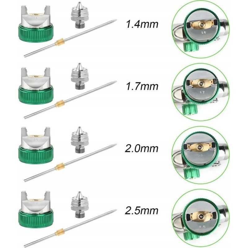 ✅ Verschiedene Düsen: Vier verschiedene Düsen mit Nadeln (1,4 + 1,7 + 2,0 + 2,5) ermöglichen die Anpassung der Pistole an verschiedene Lackierarbeiten.