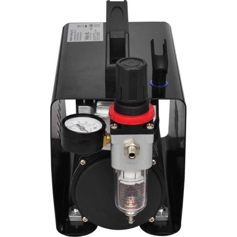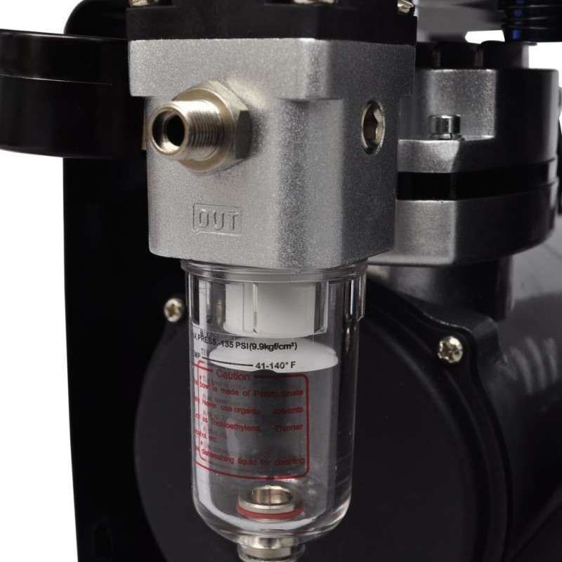 Dieser Minikompressor mit Luftregulierung, Luftfilter und Manometer eignet sich hervorragend für Pistolen mit einer Düsengröße von 0,2 bis 1,0 mm.