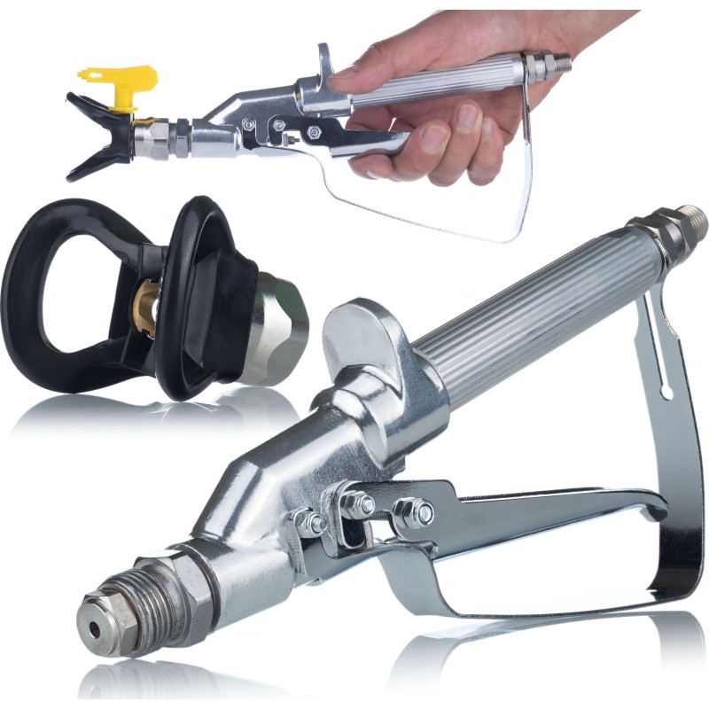 Robuste Konstruktion: Die Metallkonstruktion mit Karbidventil und drehbarer Düse sorgt für Langlebigkeit und Widerstandsfähigkeit. Die Spritzpistole ist mit einem Fingerfilter im Griff ausgestattet, der ein Verstopfen der Düsen verhindert.