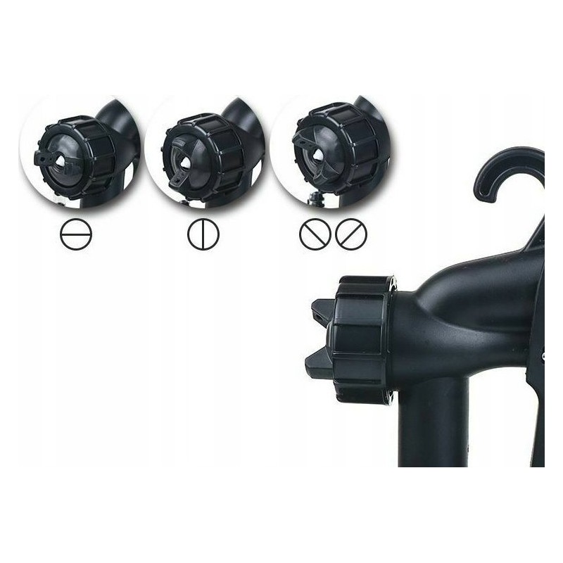 Die Spritzpistole ist mit einer drehbaren Düse ausgestattet, mit der sich die Breite und Form des Farbstrahls regulieren lassen. Der Anwender kann zwischen einem runden, vertikal ovalen oder horizontal ovalen Strahl wählen, was präzises Streichen oder das Beschichten großer Flächen ermöglicht.