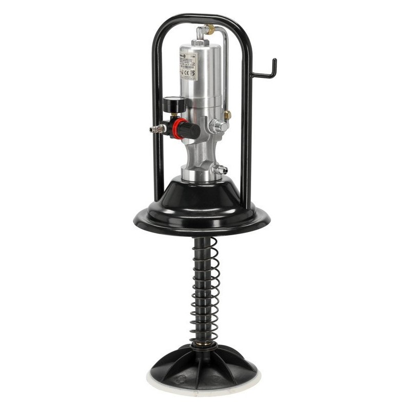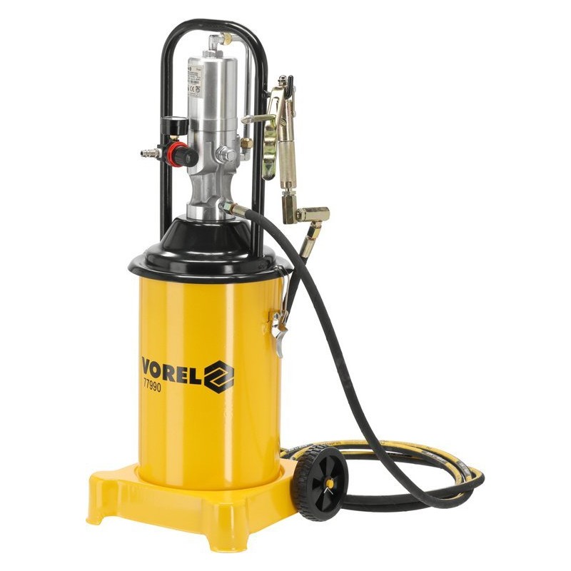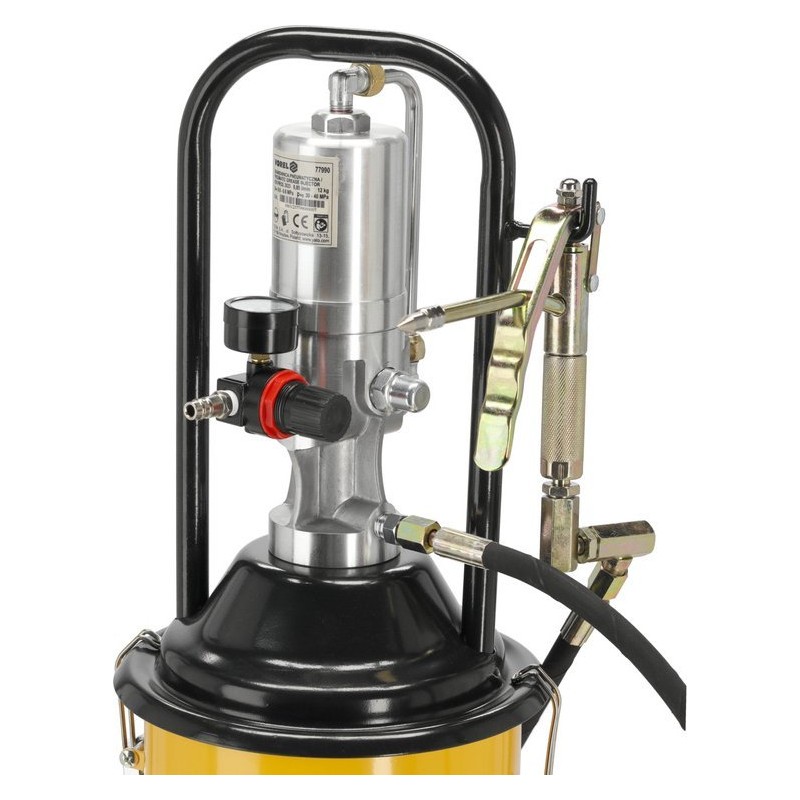 Pneumatische Schmierpistole mit flexiblem Schlauch und Metallpistole. Ausgestattet mit Rollen für eine einfache Handhabung.