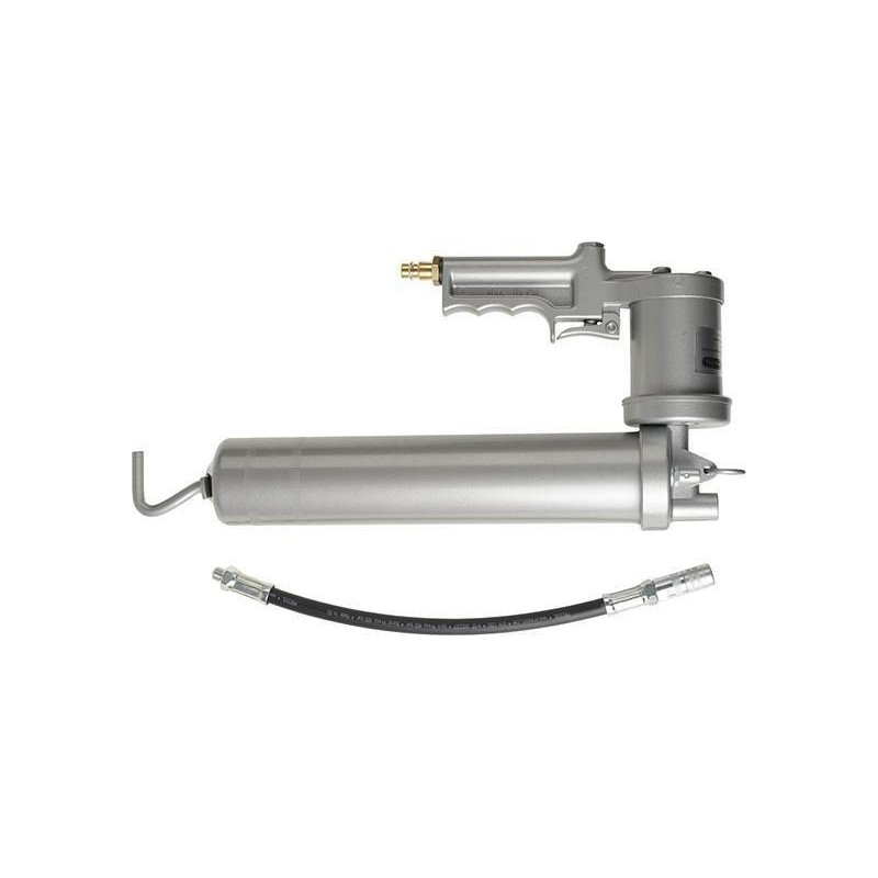 Pneumatische Schmiervorrichtung Ausführung: Aus lackiertem Stahlrohr. Schmiermittelzufuhr bei jedem Öffnungswinkel des Handhebels. Zum Befüllen mit losem Schmiermittel, 400-g-Schmierkartuschen gemäß DIN 1284 oder einer Schmiermittel-Befüllvorrichtung. Anschlussgewinde M10 x 1. Lieferung mit Panzerschlauch und 4-Backen-Präzisions-Schmierdüse....