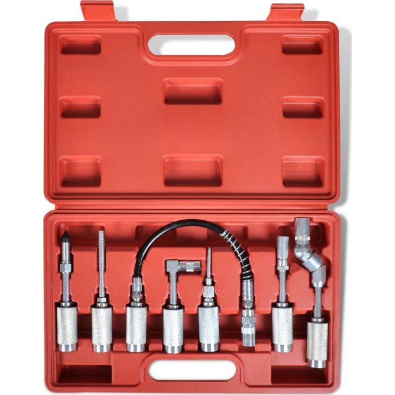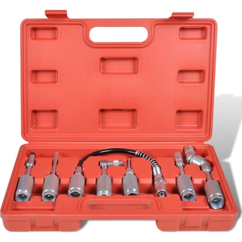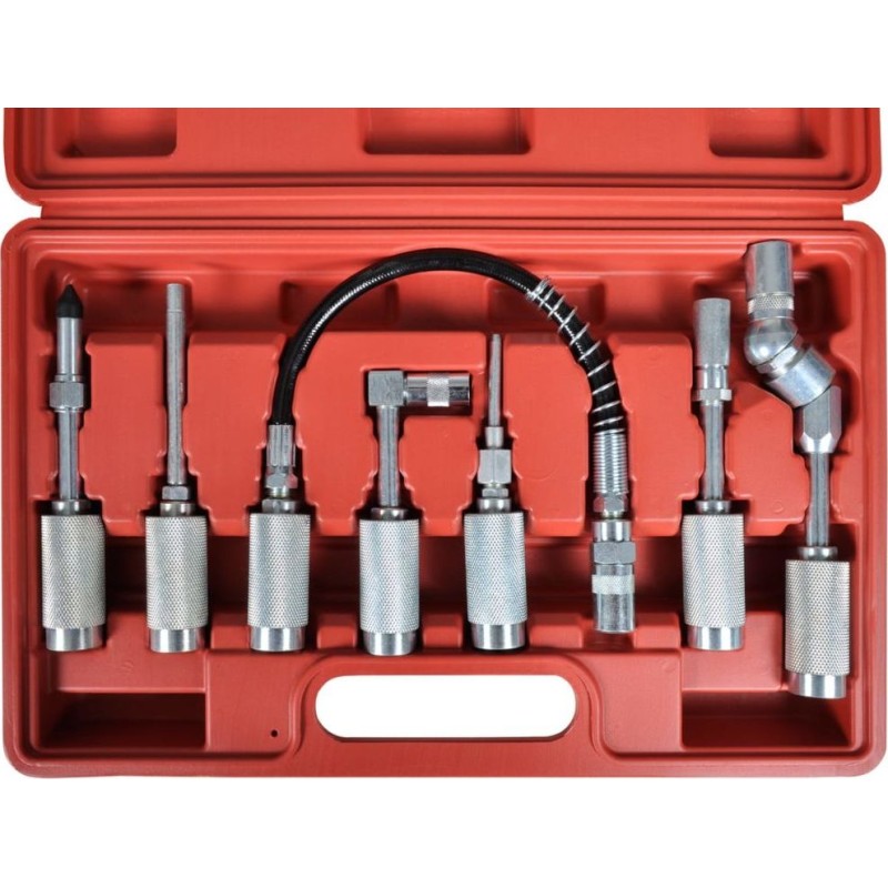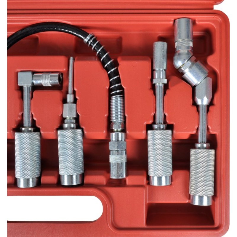 Das Set enthält alle notwendigen Teile, um jede Schmierarbeit zu erleichtern. Es ist mit fast allen Schmierstoffsorten führender Marken sowie mit Handschmiergeräten kompatibel. Das Set enthält: eine Schmierpistole (90), eine Verlängerung, einen Schlauchverlängerer (400 mm), einen um 90° verstellbaren Anschluss, eine Düse mit Gummispitze, eine Düse mit Nadelspitze sowie einen 360°-Anschluss – also alles, was man für die Schmierung benötigt. Das Ganze in einer praktischen Tragetasche.