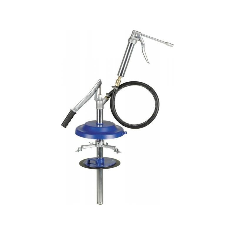Schmiergerät-Set Ausführung: Mit Handpumpe (Pumpenlänge 530 mm), abnehmbarer Einhandpistole, Nachlaufkolben und 1,5 m langem Schlauch. Einhandpistole mit einem Fassungsvermögen von 125 cm³, ausgestattet mit einem Rohr mit 4-Backen-Schmierdüse und Kugelventil. Die Förderleistung beträgt 0,4 cm³ pro Hub. Anschlussgewinde M10 x 1....