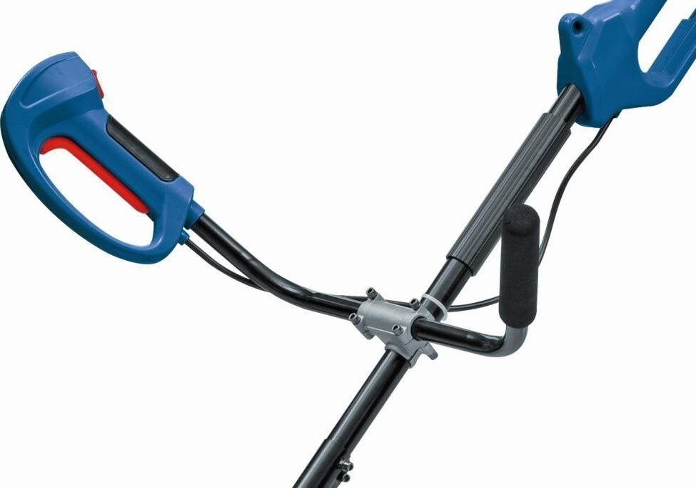 Die Kraftübertragung über eine geteilte Antriebswelle macht das Gerät langlebig und lässt sich nach dem Zerlegen bequemer transportieren und lagern. Die Elektrosense ist im Betrieb zudem deutlich leiser als ihr benzinbetriebenes Pendant. Die Schutzabdeckung aus elastischem Kunststoff dämpft Vibrationen hervorragend und ist stoßfest.