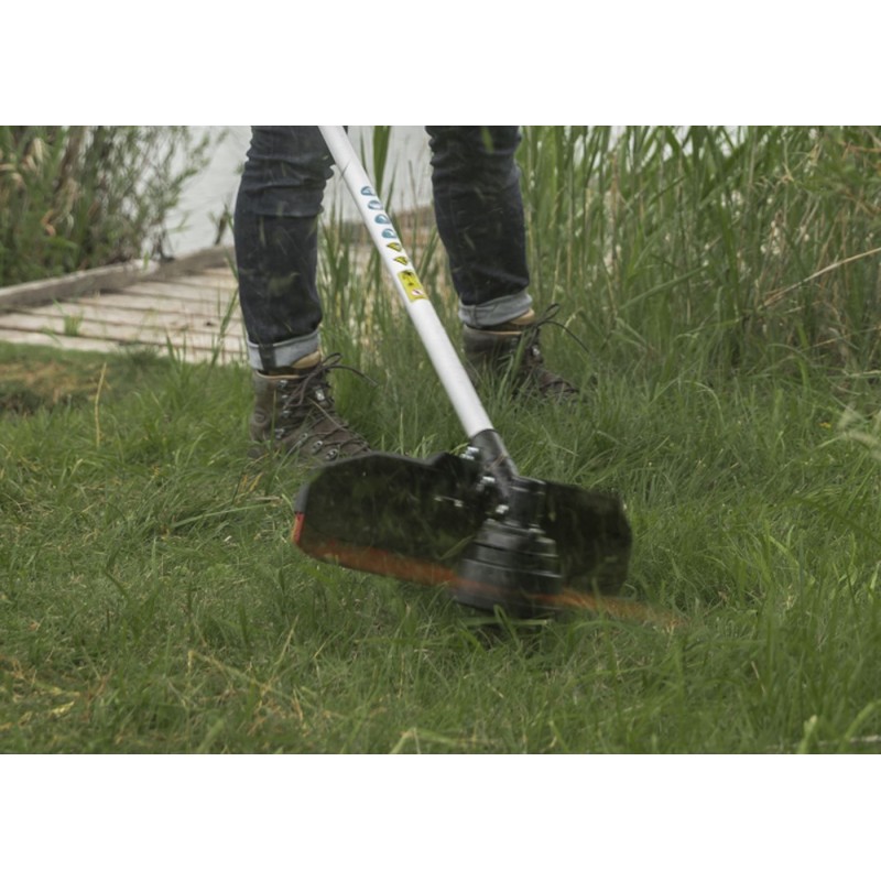 Die Kopfschutzhaube schützt die Pflanzen und ermöglicht präzises Trimmen auch unter Sträuchern oder an Wänden und Mauern, ohne diese zu beschädigen.