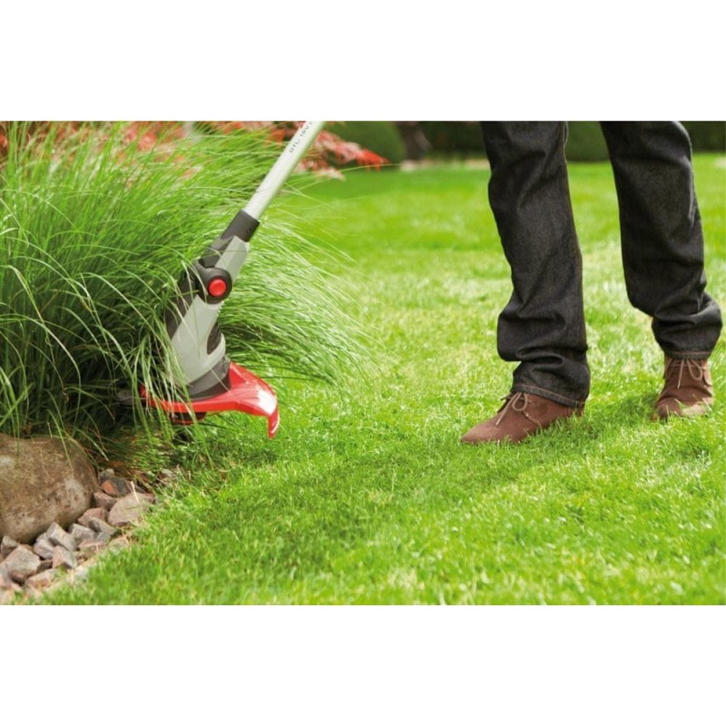 • Stichwort: Leistungsstarker 450-W-Motor mit Überlastschutz, , Drehbarer Griff und Führungsrolle erleichtern das Arbeiten entlang von Kanten, Schutzbügel hält einen sicheren Abstand und verhindert Schäden an Pflanzen und Wänden, Der geneigte Schneidkopf gewährleistet einen problemlosen Zugang zu schwer erreichbaren Stellen, Automatische Drahtlängenverstellung