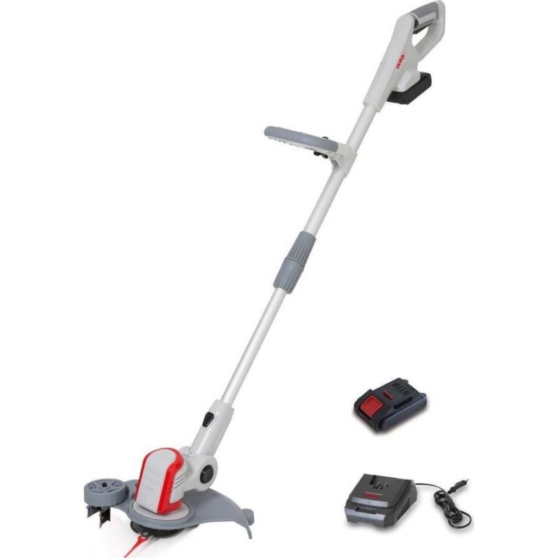- Der Rasentrimmer wird mit einem 20V-Akku (2,0 Ah) und einem Ladegerät geliefert.