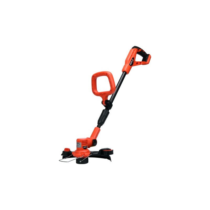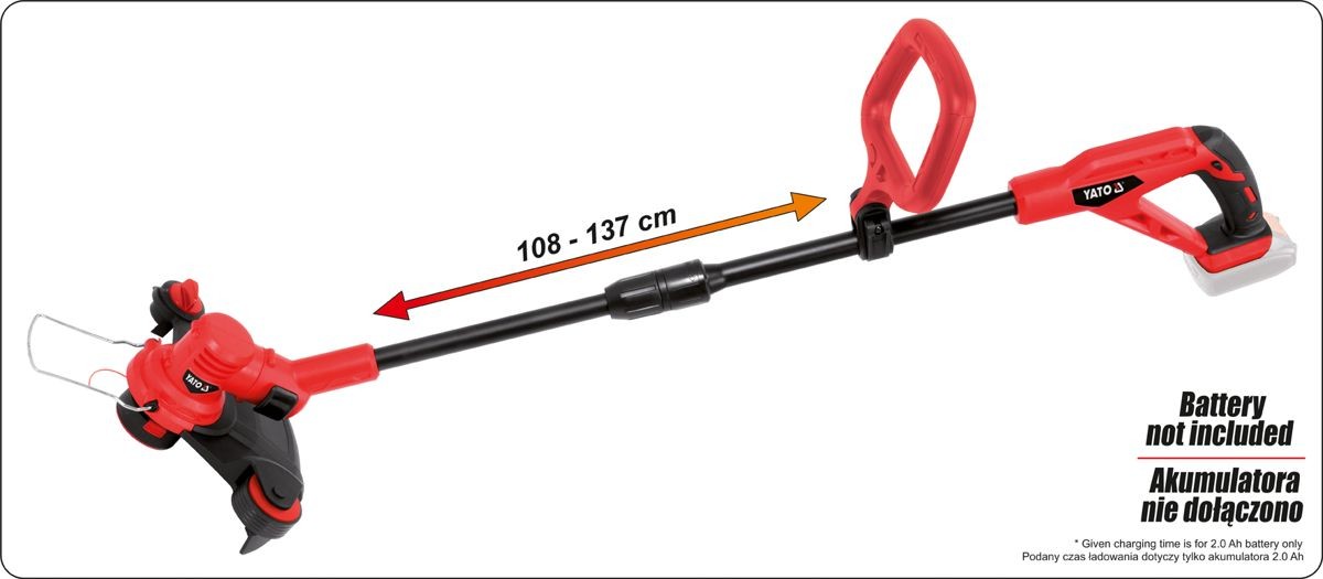 Leistungsstarker, leichter und perfekt ausbalancierter Rasentrimmer. Der Teleskopgriff lässt sich genau an die Körpergröße und Reichweite des Benutzers anpassen. Die Betriebszeit des Trimmers mit einem 2-Ah-Akku beträgt 30 Minuten. Die hochwertige Verarbeitung der Schutzabdeckung und des Gehäuses garantiert die Langlebigkeit des Geräts und einen störungsfreien Betrieb. Der Fadenkopf verfügt über ein System zum einfachen Abwickeln und Auswechseln des Schneidfadens.
