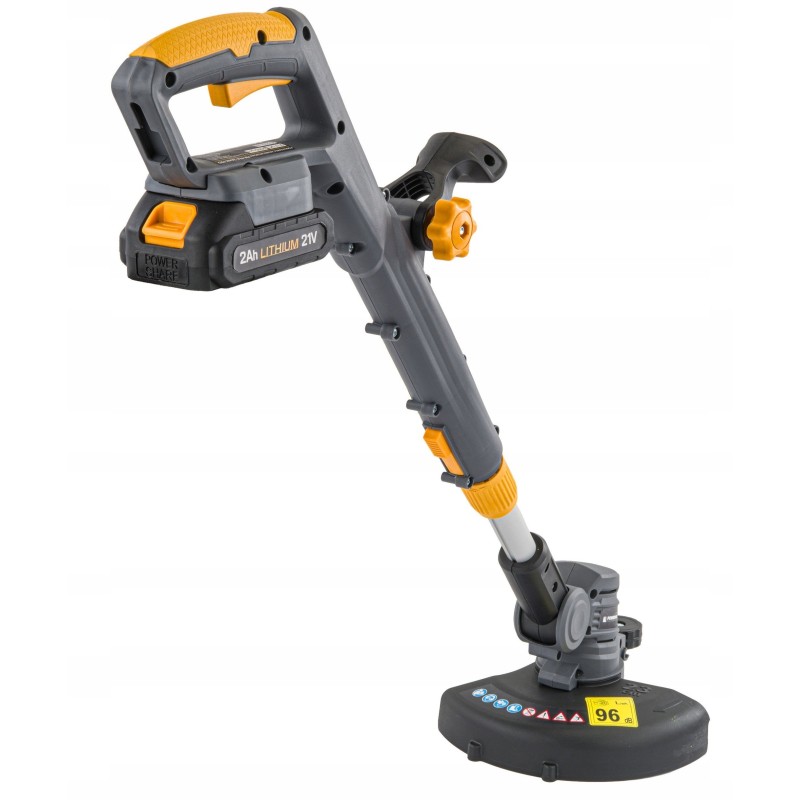 • Lieferumfang – Rasentrimmer, 2 Lithium-Ionen-Akkus 2,0 Ah / 21 V, Fadenkopf, Ladegerät, Bedienungsanleitung