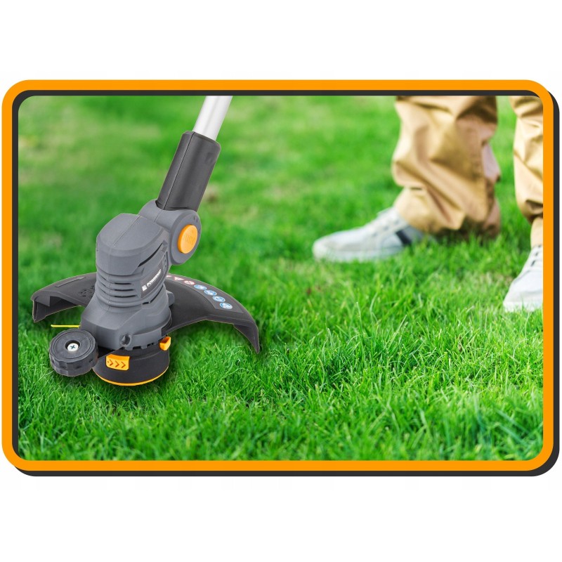 Dank der hohen Arbeitsbreite von 230 mm und einer Motordrehzahl von 9000 Umdrehungen pro Minute meistert der Rasentrimmer das Mähen von Gras an Stellen, an denen herkömmliche Geräte Schwierigkeiten haben könnten, mit Bravour. Dies ist die ideale Lösung für jeden Gärtner.