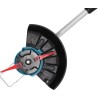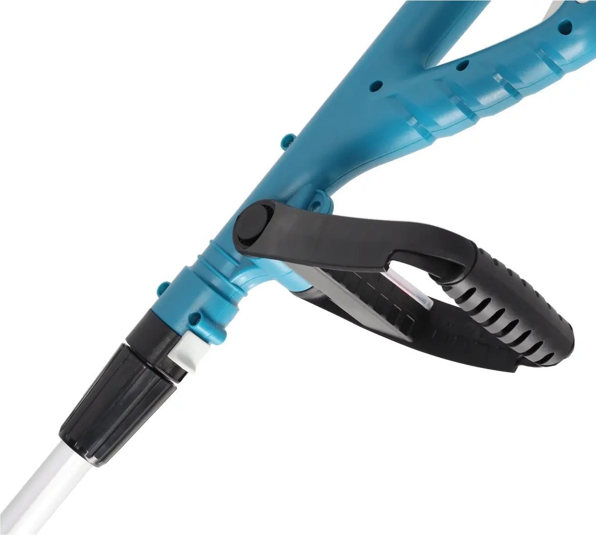 Der teleskopierbare, verstellbare Griff des Trimmers ermöglicht es dem Benutzer, die Länge an seine individuellen Vorlieben anzupassen. Darüber hinaus sorgt die Verstellbarkeit des Drehwinkels der Teleskopstange für eine einfache Manövrierbarkeit, was besonders beim Mähen an schwer zugänglichen Stellen nützlich ist. Beachtenswert ist auch der im Trimmer integrierte Metall-Kantenanschlag, der nicht nur als Führung für einen gleichmäßigen Schnitt dient, sondern es dem Benutzer auch ermöglicht, die Grenzen des Mähbereichs genau zu bestimmen.