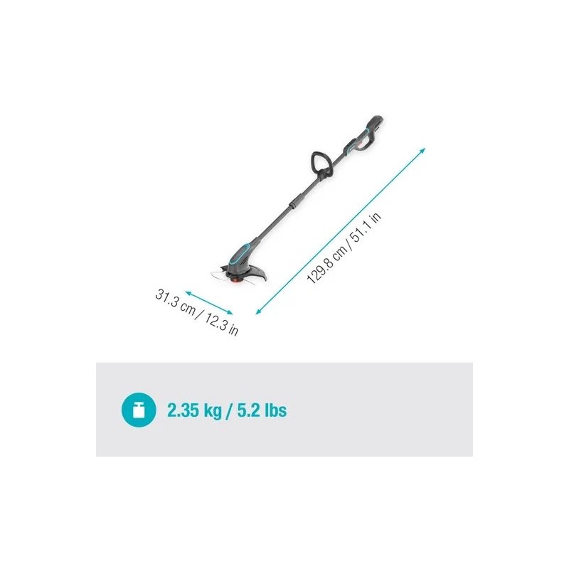 Mit einer Breite von 313 mm und einer Länge von 1298 mm ist der Gardena PowerTrim 30 kompakt und leicht zu manövrieren. So gelangen Sie auch an schwer zugängliche Stellen im Garten, was ihn zu einem äußerst funktionalen Gerät macht.