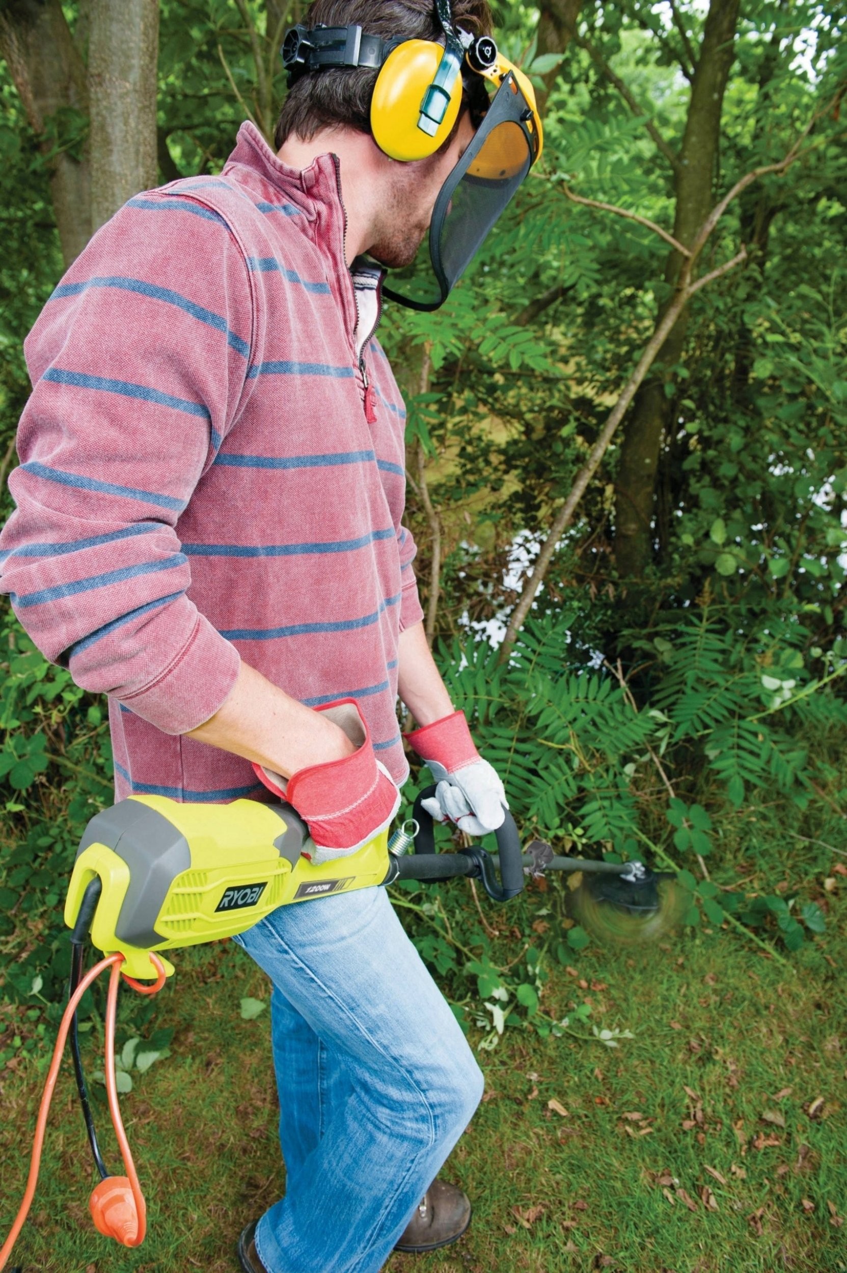 • Die elektrische Motorsense von Ryobi ist mit einem Zusatzgriff für komfortables Halten während der Arbeit ausgestattet