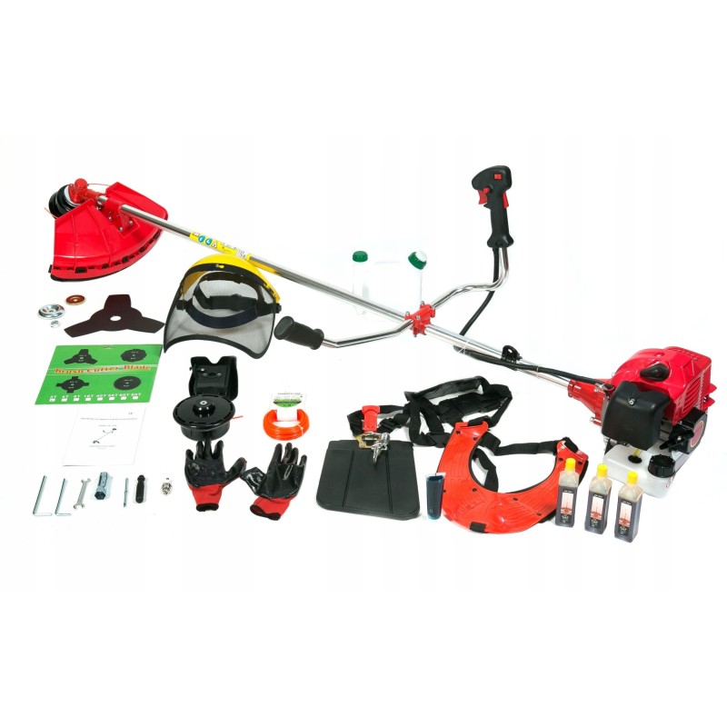 Im Lieferumfang der Motorsense sind verschiedene Messer, eine Spule mit Ersatzschnur, ein Tragegurt sowie professionelles Getriebeöl enthalten. So erhält der Anwender alles, was für eine effektive und reibungslose Arbeit erforderlich ist.