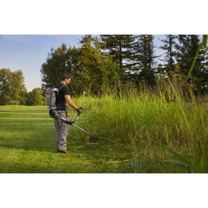 Die SBC 900 D AE bietet die Leistung eines 45-cm³-Benzin-Rasentrimmers – ganz ohne den Aufwand beim Tanken und ohne Emissionen. Zwei 48-V-Akkus mit 7,5 Ah sorgen für 1,5 Stunden ununterbrochenes Mähen. Und da diese in einem praktischen Rucksack verstaut sind, profitierst du von einem optimalen Verhältnis zwischen Leistung und Gewicht. Von großen Gärten und landwirtschaftlichen Flächen bis hin zu Stadtparks – wo auch immer du arbeitest, erleichtern das ergonomische Design des Doppelgriffs und die kompakte Schutzhaube das Mähen von hohem Gras oder dichter Vegetation. Zur besseren Kontrolle befinden sich am Lenker mit Softgriff vier integrierte LEDs zur Überwachung des Akkuladezustands. Die Schnittbreite von 43 cm ist zudem mit dem Bump & Work-System ausgestattet, das für einen schnellen Fadenzufuhr zum Schneidkopf sorgt. Nach getaner Arbeit lässt sich der Griff um 90° umklappen, um Transport und Lagerung zu erleichtern.