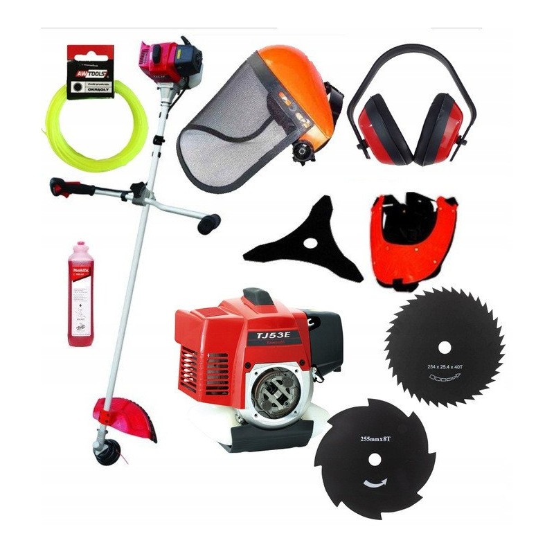 Die Motorsense KAWASAKI TJ53E wird mit einem umfangreichen Zubehörset geliefert, darunter verschiedene Schneidscheiben, ein Fadenkopf, ein doppelter Tragegurt, Ohrenschützer und ein Gesichtsschutz. Im Lieferumfang sind außerdem Öl für das Kraftgemisch sowie Montageschlüssel enthalten, was sie zu einem kompletten Werkzeug für die Gartenarbeit macht.