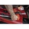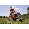 Das Mähwerk mit zwei Messern sorgt für einen präzisen Schnitt auf einer Breite von 93 cm. Die Schnitttiefenverstellung von 30 mm bis 80 mm ermöglicht die Anpassung an unterschiedliche Bedingungen. Stützräder schützen die Messer vor Beschädigungen auf unebenem Gelände und verhindern so das Abtragen der Grasnarbe. Ein Hebel auf der rechten Seite des Sitzes erleichtert die Einstellung der Schnitthöhe. Die Aktivierung der Messer erfolgt über einen Knopf am Armaturenbrett des Traktors, der eine elektromagnetische Kupplung betätigt. Diese Kupplung zeichnet sich durch einfache Bedienung, Zuverlässigkeit und Verschleißfestigkeit aus und garantiert einen sanften, ruckfreien Anlauf der Messer.