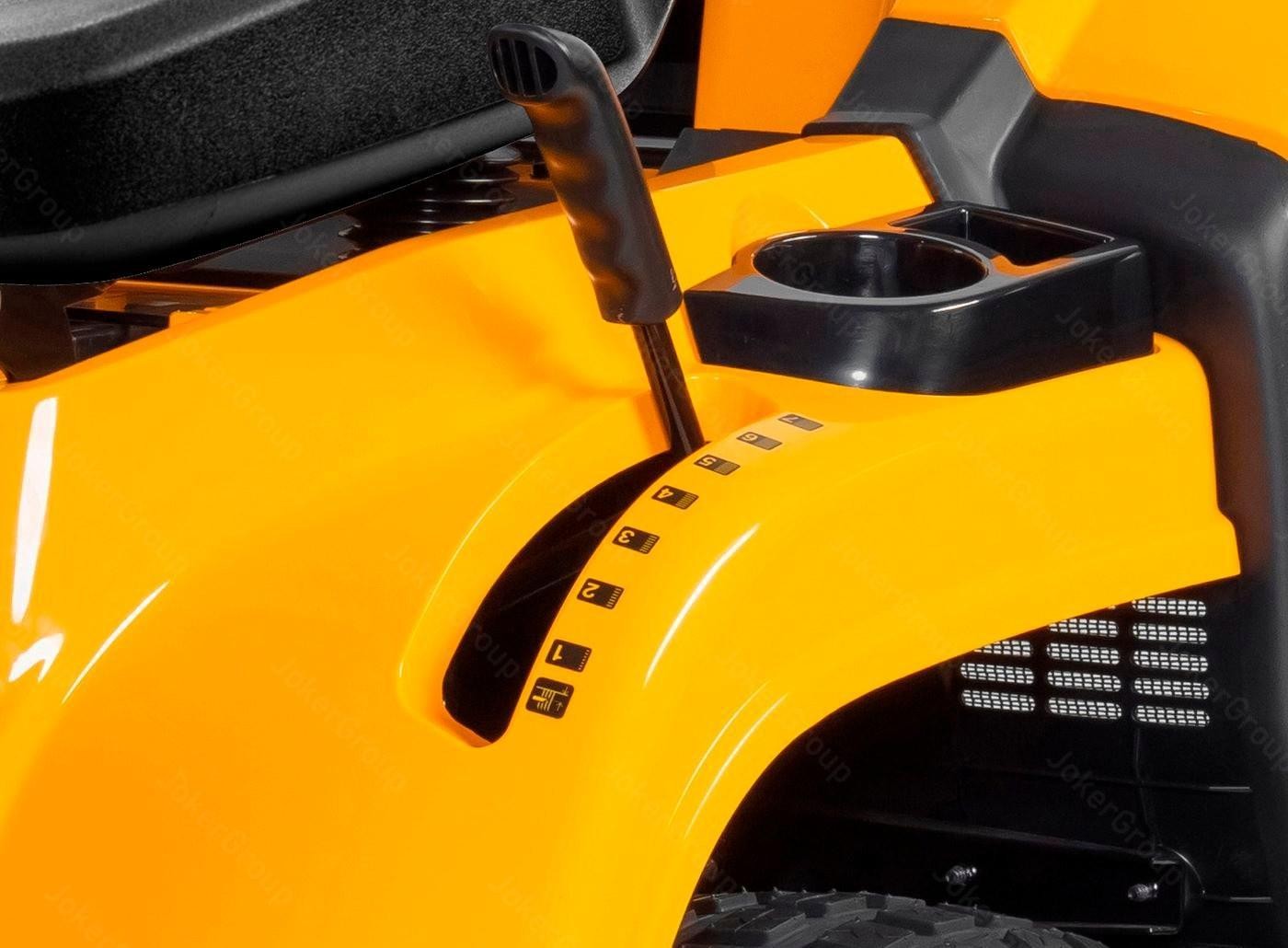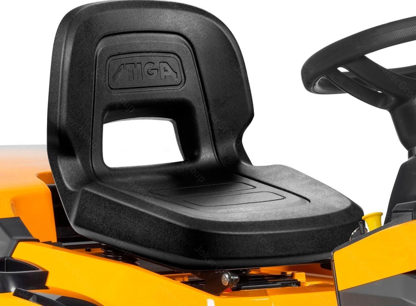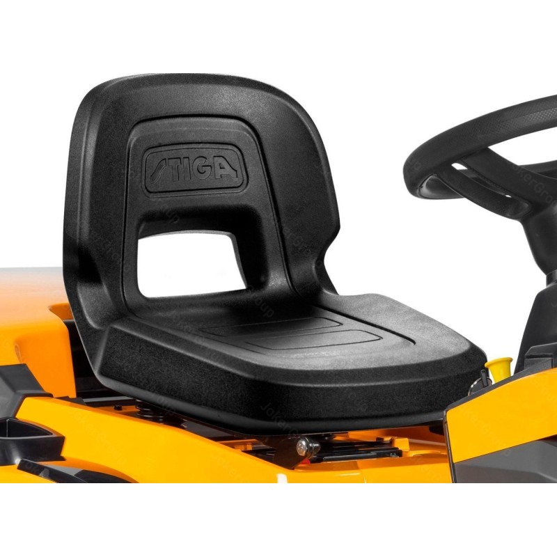 Mit dem Gartentraktor Estate 584 müssen Sie nicht mehr schalten, um die Fahrgeschwindigkeit anzupassen – stattdessen können Sie über das Fußpedal stufenlos beschleunigen und abbremsen. Dadurch verfügt die Maschine über eine optimierte Manövrierfähigkeit, und das Umfahren von Hindernissen wird deutlich einfacher. Das 84 cm breite Mähwerk lässt sich um sieben Grad (25–80 mm) anheben und absenken, um es sowohl an die Graslänge als auch an das vom Fahrer gewünschte Endergebnis anzupassen. Leistungsstarke, aber energiesparende LED-Scheinwerfer ermöglichen es, zu jeder Tageszeit weiter zu mähen. Der verstellbare Sitz und das höhenverstellbare Lenkrad sorgen für höchsten Fahrkomfort. Ebenfalls enthalten sind eine einfache elektromagnetische Zapfwellenaktivierung, Räder zum Schutz vor Abstreifen sowie eine Frontstoßstange, die Schäden durch versehentliche Stöße verhindert. Das Mulchkit, die Anhängerkupplung und das Ladegerät sind separat erhältlich. Das ergonomische STIGA-Lenkrad sorgt in Kombination mit dem verstellbaren STIGA Classic-Sitz mit hoher Rückenlehne für Fahrkomfort.