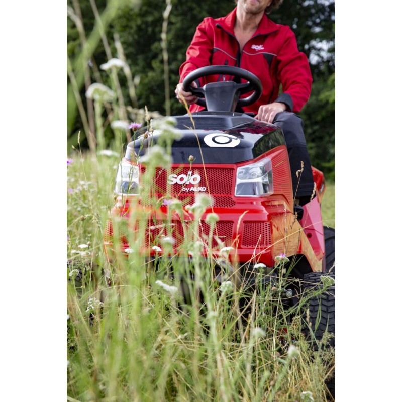 Für anspruchsvolle Menschen, die ihre Zeit und ihren Komfort schätzen, präsentieren wir eine hervorragende Maschine, die dem Nutzer ein völlig neues Erlebnis bei der Pflege von hohem Gras bietet – den Gartentraktor Solo by AL-KO T22-110.0 HDH-A V2. Er ist das Ergebnis neuester technologischer Lösungen sowie der Suche nach einer Antwort auf die Frage, wie man die Arbeit auf großen Wiesenflächen zeitsparend gestalten und gleichzeitig ein hervorragendes Ergebnis erzielen kann. Da wir dies sehr gut verstehen, bieten wir Ihnen eine Maschine an, die die Arbeit zum Vergnügen macht und ein hervorragendes Ergebnis garantiert. Dank des deutlich größeren Arbeitsbereichs lässt sich das Mähen bis zu einem Dutzend Mal schneller erledigen als mit einem herkömmlichen Rasenmäher. Durch die Verkürzung der für die Pflege eines weitläufigen Geländes benötigten Zeit erhält der Nutzer nicht nur eine wunderschön gemähte Fläche in deutlich kürzerer Zeit, sondern gewinnt auch mehr Freizeit für sich und seine Familie.