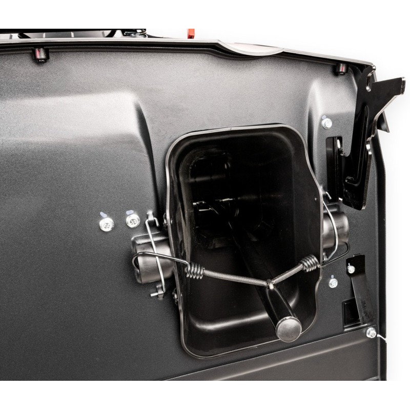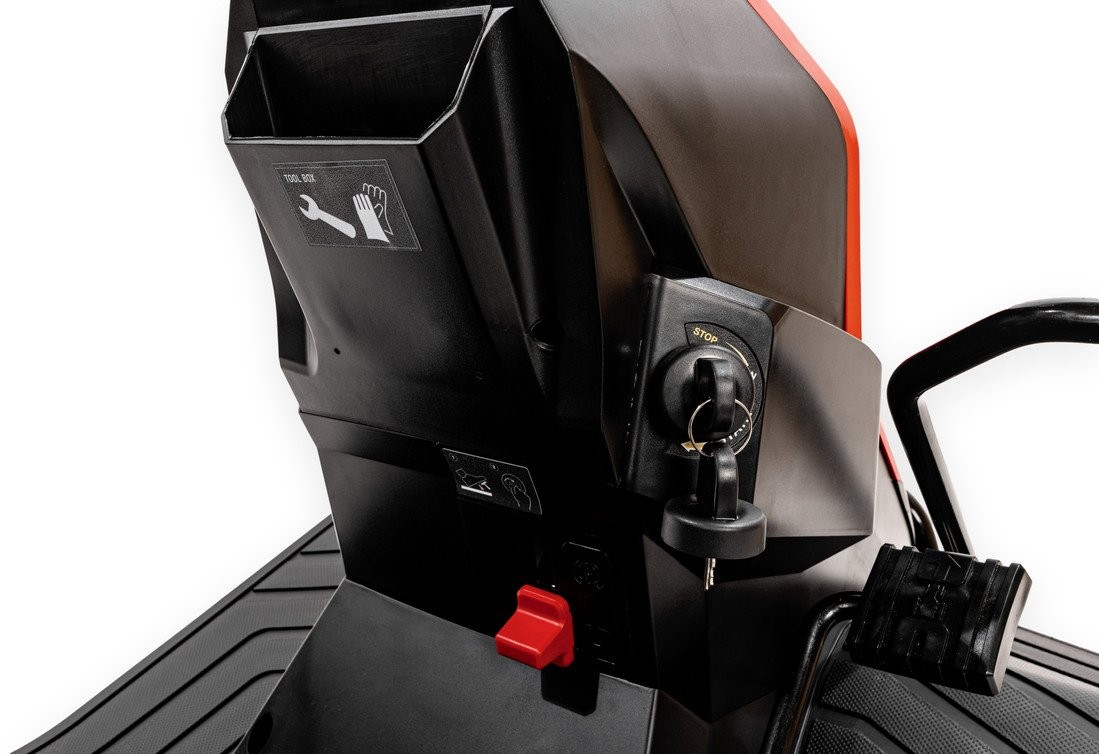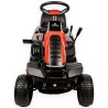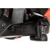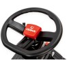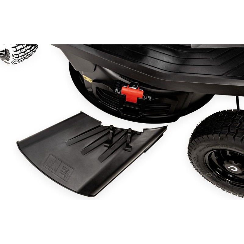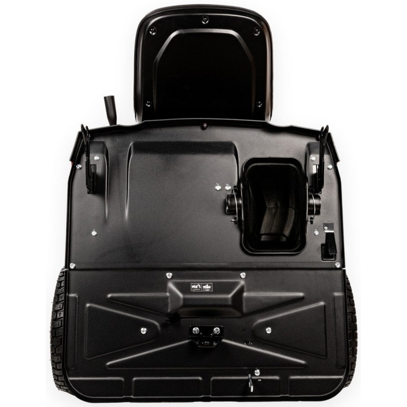 Der solide und robuste Rahmen des Traktors sorgt für Stabilität und Langlebigkeit, während die großen Räder (vorne 13", hinten 15") eine gute Traktion auf unebenem Gelände garantieren. Darüber hinaus erleichtern der kleine Wenderadius und der Teleskophebel zum Entleeren des Grasfangkorbs das Manövrieren und die Bedienung.