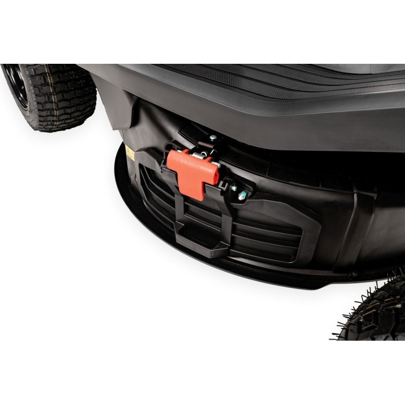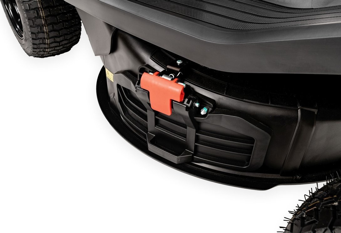 • Eine breite Frontabdeckung aus hochfestem Stahl schützt den Mäher vor versehentlichen Stößen.