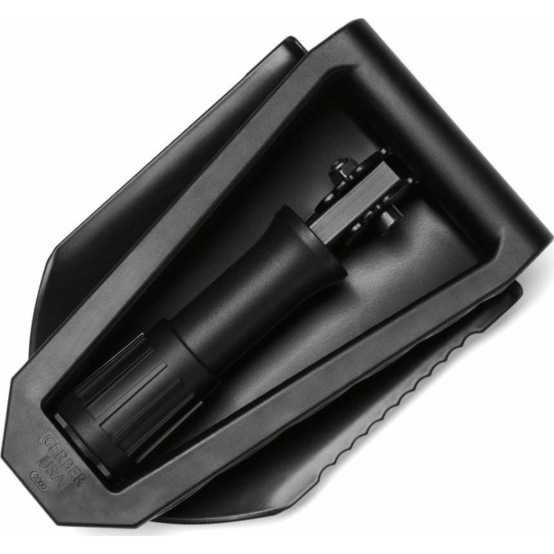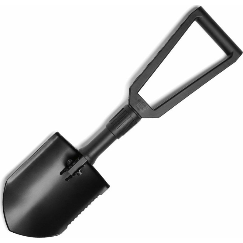 Leichte, dreifach zusammenklappbare Schaufel mit gezahnter Schaufelseite, hergestellt von Gerber Gear. Dank der gezahnten Verbindung zwischen Schaufel und Stiel lässt sie sich in verschiedenen Winkeln drehen.