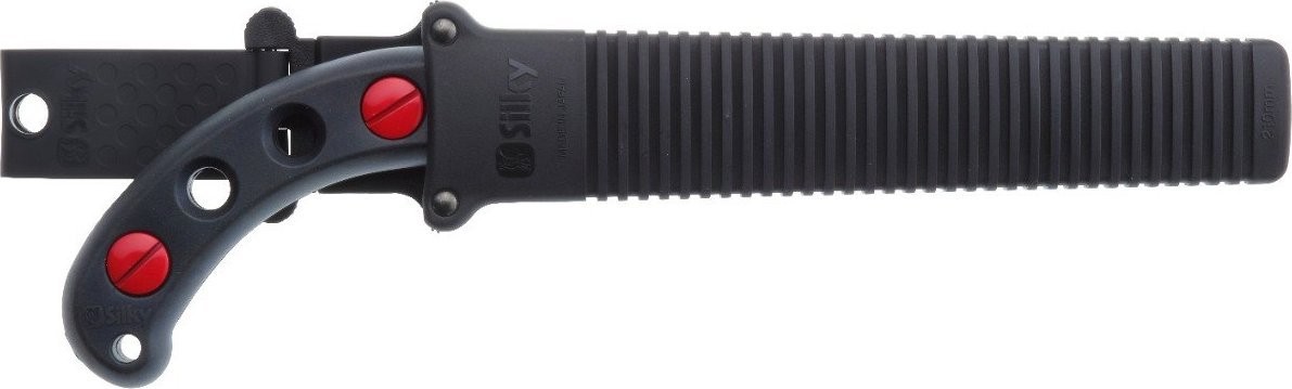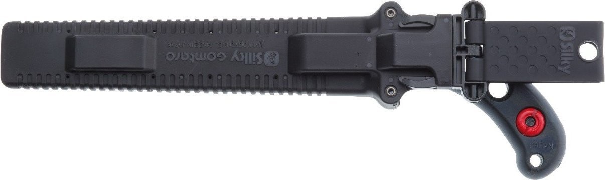 Die Scheide der Silky Gomtaro-Handsäge wurde so konzipiert, dass sie die Säge in allen Positionen sicher hält. Selbst wenn man sie auf den Kopf stellt, rutscht die Säge nicht heraus. Dies verhindert eine spezielle Verriegelung am Eingang der Hülle. Die Hülle ist zudem mit zwei Rollen ausgestattet, die Beschädigungen beim Einstecken der Säge in die Hülle verhindern. Zusätzlich befindet sich im unteren Teil des Gehäuses eine kleine Öffnung, die Feuchtigkeit und Sägespäne ableiten soll. Besondere Aufmerksamkeit verdient auch der gegossene Gummigriff der Säge. Er liegt bequem in der Hand, ist perfekt ausbalanciert und dämpft Vibrationen.
