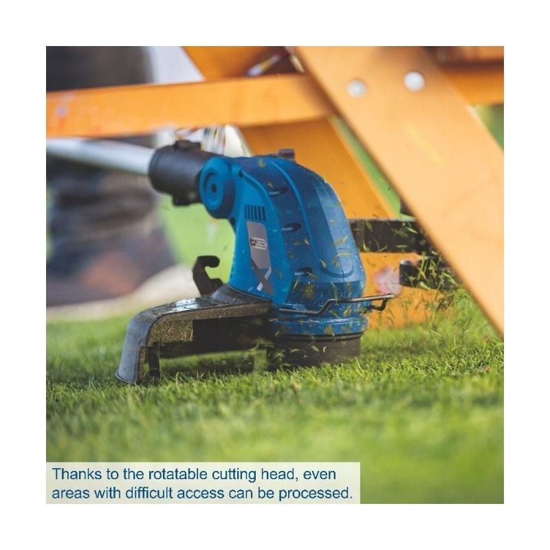 TECHNISCHE DATEN Abmessungen (L x B x H): 1235 x 335 x 356 mm Motortyp: Bürstenmotor Akkuspannung: 20 V Maximale Schnittbreite: 300 mm Fadenlänge: 3 m Höhenverstellung: Bis 270 mm Winkelverstellung: 0° – 90° Schneidkopf: Schwenkbar