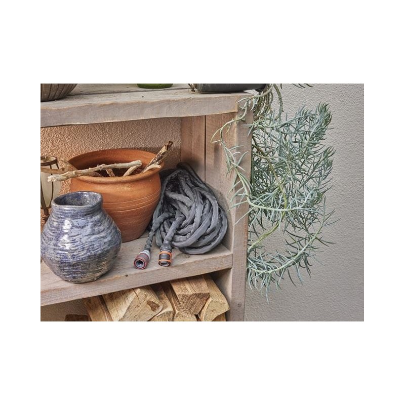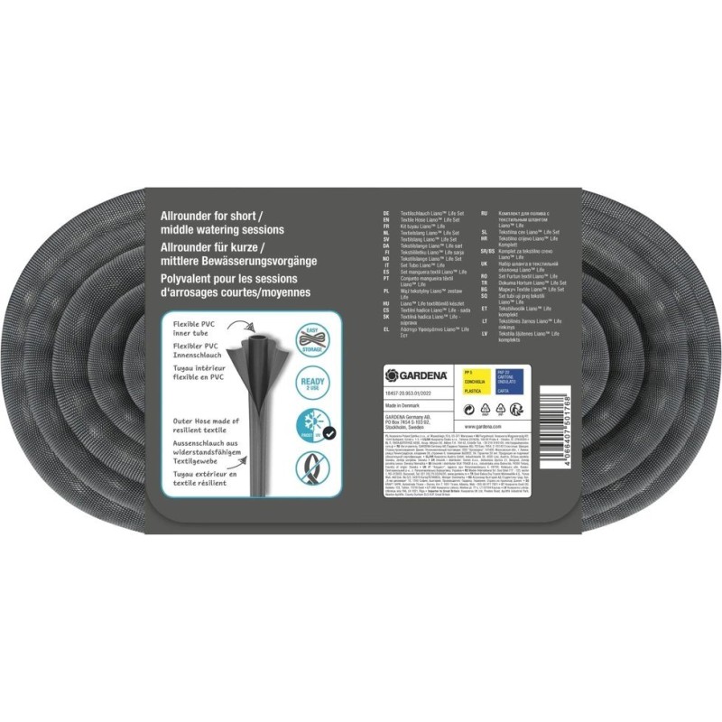 Der Liano™ Life Textilschlauch 30 m – Set von GARDENA eignet sich ideal für die kurz- bis mittelfristige Bewässerung. Der Liano™ Life mit einer Länge von 30 m ist eine hervorragende Lösung für große Gärten. Das Set enthält einen vielseitigen Schlauch mit einem Durchmesser von 13 mm (1/2"), Original GARDENA System-Komponenten, Liano™-Schnellkupplungen, eine Liano™-Schnellkupplung aus Metall, eine Sprühpistole sowie zwei Wasserhahnanschlüsse. Ein Reduzierstück an einem der Wasserhahnanschlüsse ermöglicht den Anschluss des Schlauchs an Gewinde in drei verschiedenen Größen. Liano™ Life besteht aus einem flexiblen PVC-Innenschlauch und einem innovativen Geflecht aus strapazierfähigem Gewebe, was für einen zuverlässigen Betrieb sorgt. Bei der Gartenbewässerung und bei Reinigungsarbeiten rund ums Haus bietet Liano™ Life hohen Bedienkomfort. Er fühlt sich angenehm an und liegt gut in der Hand. Er verdreht sich nicht und knickt nicht ein beim Manövrieren, sodass Hindernisse leicht umgangen werden können. Das geringe Gewicht des Textilschlauchs ist besonders bei längerem Gebrauch wichtig: Er ist bis zu 50 % leichter als herkömmliche PVC-Schläuche. Dank seiner Flexibilität lässt sich der Liano™ Life platzsparend verstauen. Der Textilschlauch passt sowohl auf ein Regal als auch in die Garage. Der Liano™ Life-Schlauch ist druckbeständig bis 22 bar. Dank seiner UV- und Frostbeständigkeit kann er im Freien gelagert werden. Darüber hinaus ist er frei von Schadstoffen wie Phthalaten (<0,1 %) sowie Cadmium, Blei und Barium (<0,1 %). Entwickelt, um den größten Herausforderungen gerecht zu werden, bestimmt für den täglichen Gebrauch. Liano™-Textilschläuche.