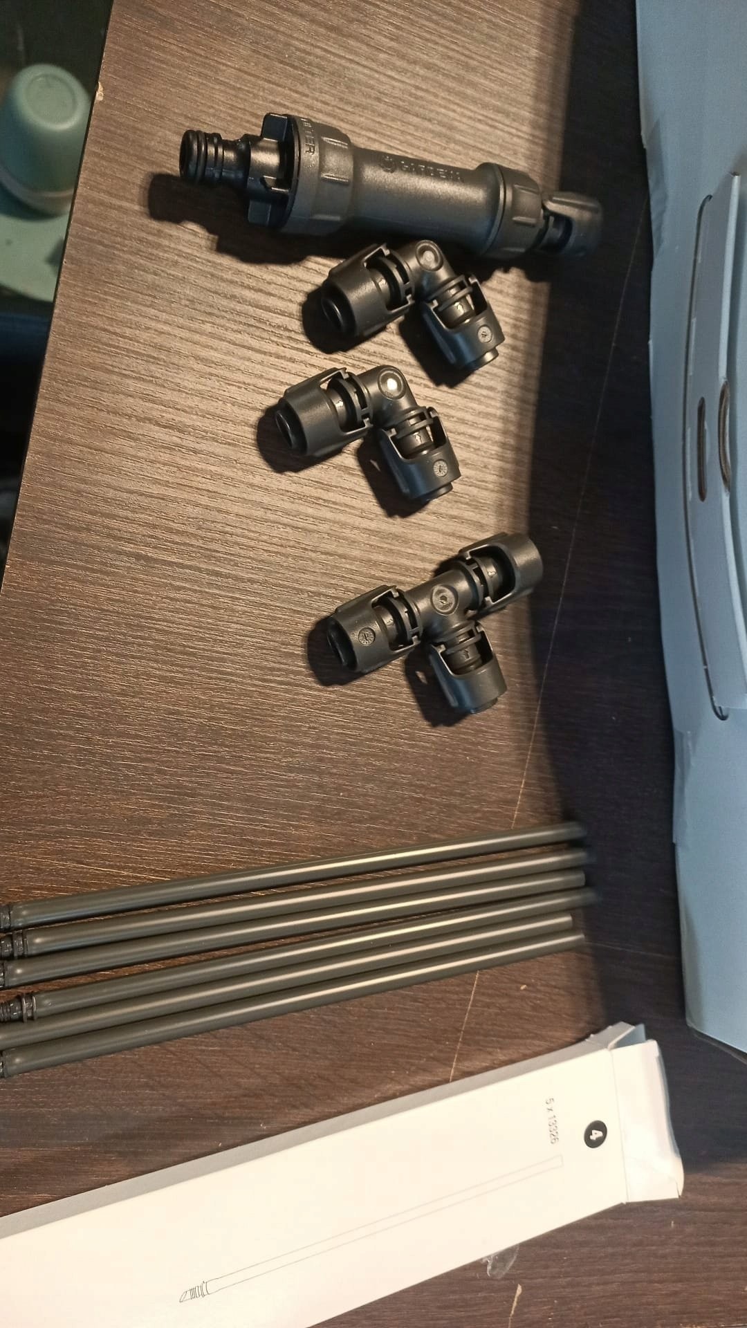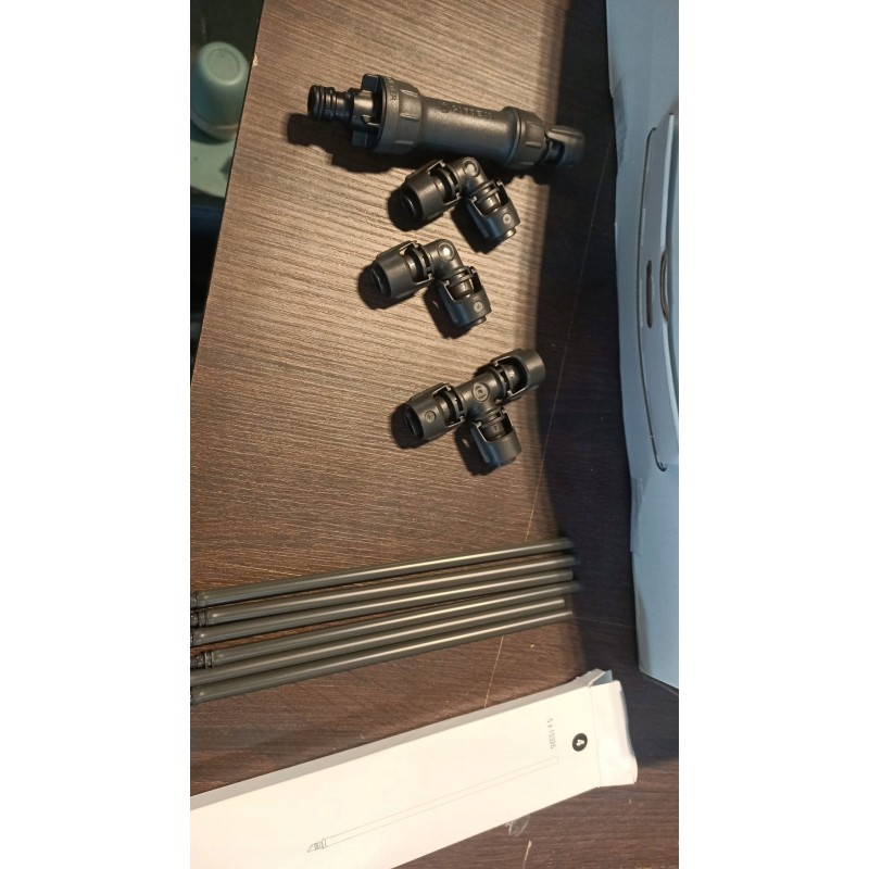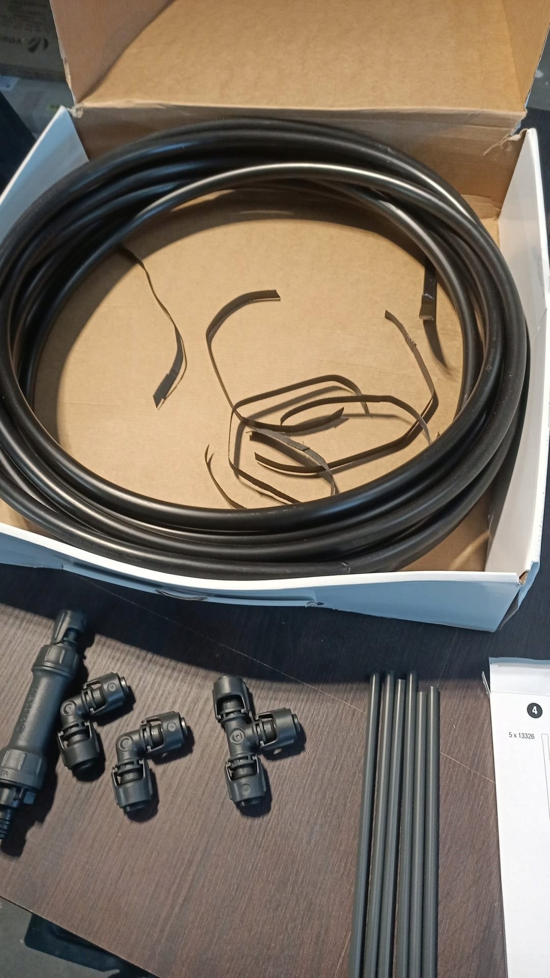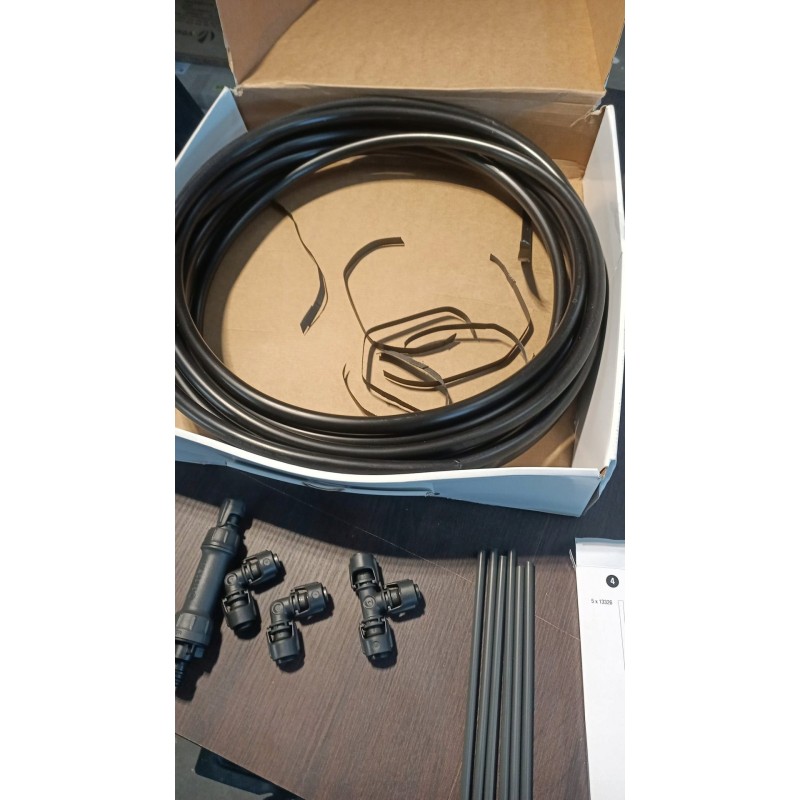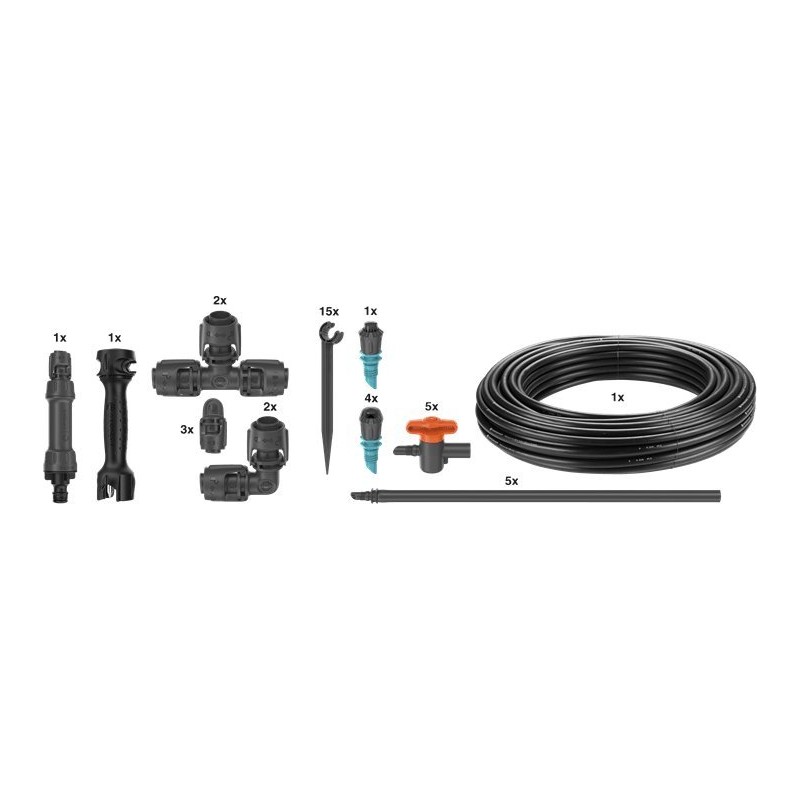 • Micro-Drip, Basisset 1000, 1x Montagewerkzeug, 25 m Flex-Installationsschlauch 13 mm (1/2 Zoll), 15x Rohrhalter 13 mm (1/2 Zoll), 2x T-Stücke 13 mm (1/2 Zoll), 2x L-Stücke 13 mm (1/2 Zoll), 3x Verschlussstopfen 13 mm (1/2 Zoll), 5x Regelventile 4,6 mm (3/16 Zoll), 4x Sprühdüsen 90 Grad, 1x Sprühdüse 360 Grad, 5x Verlängerungsrohre für Sprühdüsen