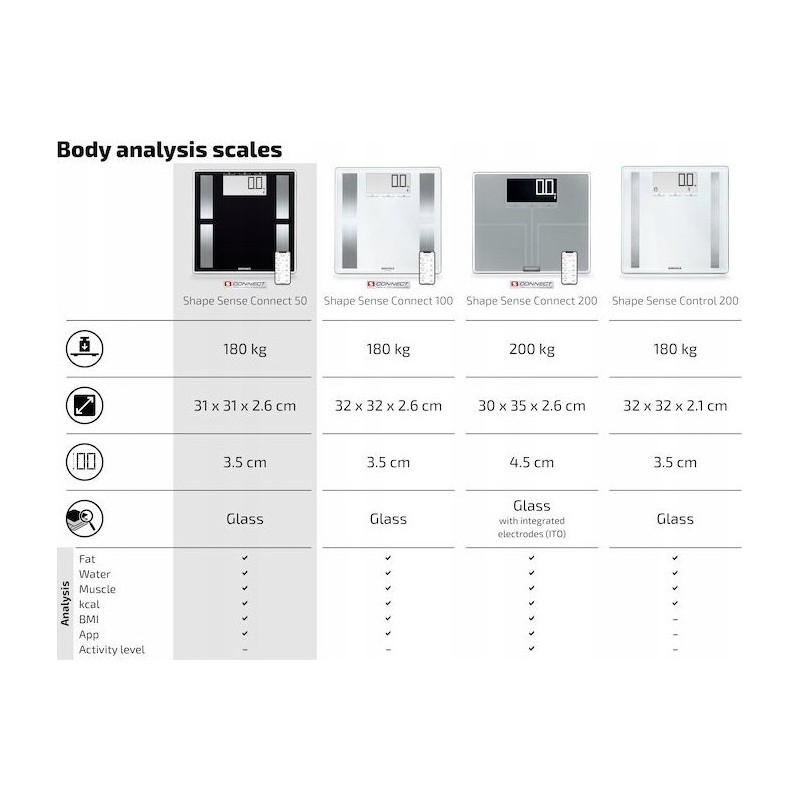 Für alle, die gesünder leben möchten: die analytische Personenwaage Shape Sense Connect 50 von Soehnle. Das mit BIA-Technologie ausgestattete Gerät ermittelt präzise das Körpergewicht und weitere Parameter wie Körperfettanteil, Wasseranteil und Muskelmasse sowie den BMI (Body-Mass-Index). Darüber hinaus hilft Ihnen die Soehnle Connect App dabei, Ihre Daten von der Shape Sense Connect 50 Analysenwaage laufend zu überwachen. Dank der App haben Sie alle Daten zu Ihrem Körper und Ihrer körperlichen Verfassung im Griff. Beobachten Sie die Veränderung gegenüber der letzten Messung oder prüfen Sie, ob das gesetzte Ziel erreicht wurde. Die App hilft dir dabei, dein Körpergewicht zu kontrollieren, und zeigt deine Fortschritte übersichtlich an. Sie ist intuitiv zu bedienen und gibt dir die volle Kontrolle über deine Daten. Sie entscheiden selbst, ob Ihre Daten nur auf Ihrem Smartphone oder auch auf dem Server gespeichert werden. Unsere App enthält zudem Tipps, die Ihnen helfen, Ihre Ziele zu erreichen, und ermöglicht es Ihnen, Ihre Fortschritte mit Freunden zu teilen. Selbstverständlich können Sie unsere App mit anderen Fitness-Apps wie „Google Fit“ oder „Apple Health“ verknüpfen. Das flache Design und die rutschfesten Füße sorgen für Stabilität. Die große Platte aus gehärtetem Glas garantiert einen stabilen Stand beim Wiegen. Die Waage zeigt das Gewicht mit einer Genauigkeit von 100 g an, die maximale Belastbarkeit beträgt bis zu 180 kg. Das Gerät ist mit einer energiesparenden automatischen Ein- und Ausschaltfunktion ausgestattet. Die analytische Personenwaage Shape Sense Connect 50 erkennt den Benutzer automatisch, sodass sie von bis zu acht Haushaltsmitgliedern genutzt werden kann – die ideale Lösung für größere Haushalte und Familien. Die im Lieferumfang enthaltenen Batterien ermöglichen eine sofortige Inbetriebnahme.