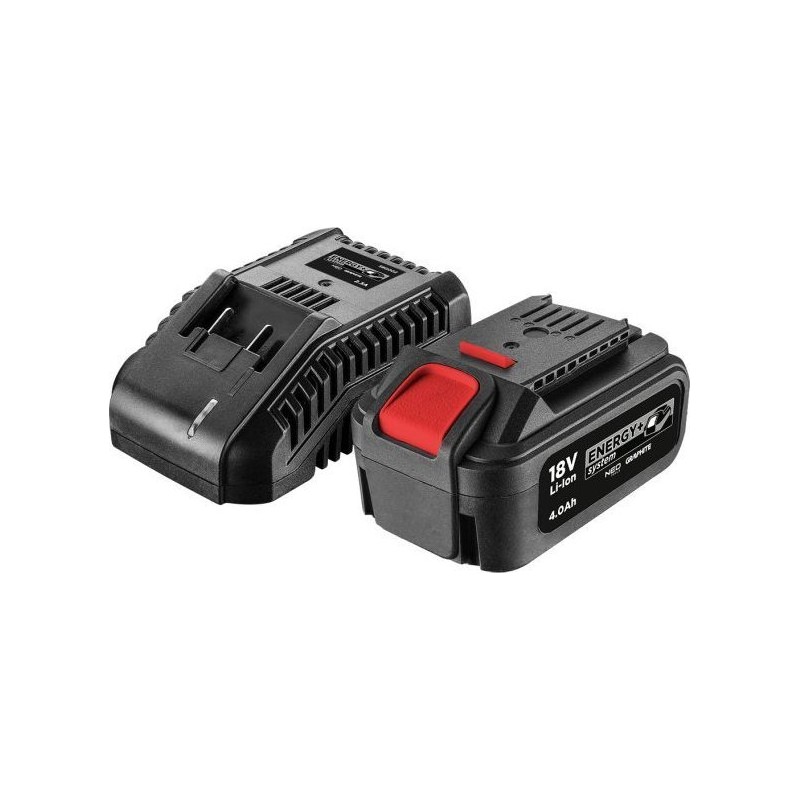 Das Energy+-Set: 4-Ah-Akku mit Ladegerät 58GE132 GRAPHITE ist das Basis-Stromversorgungsset für Elektrowerkzeuge der Marken GRAPHITE und NEO und bietet hohen Bedienkomfort. Es enthält einen Akku mit erhöhter Kapazität von 4 Ah sowie ein einfach zu bedienendes Ladegerät.