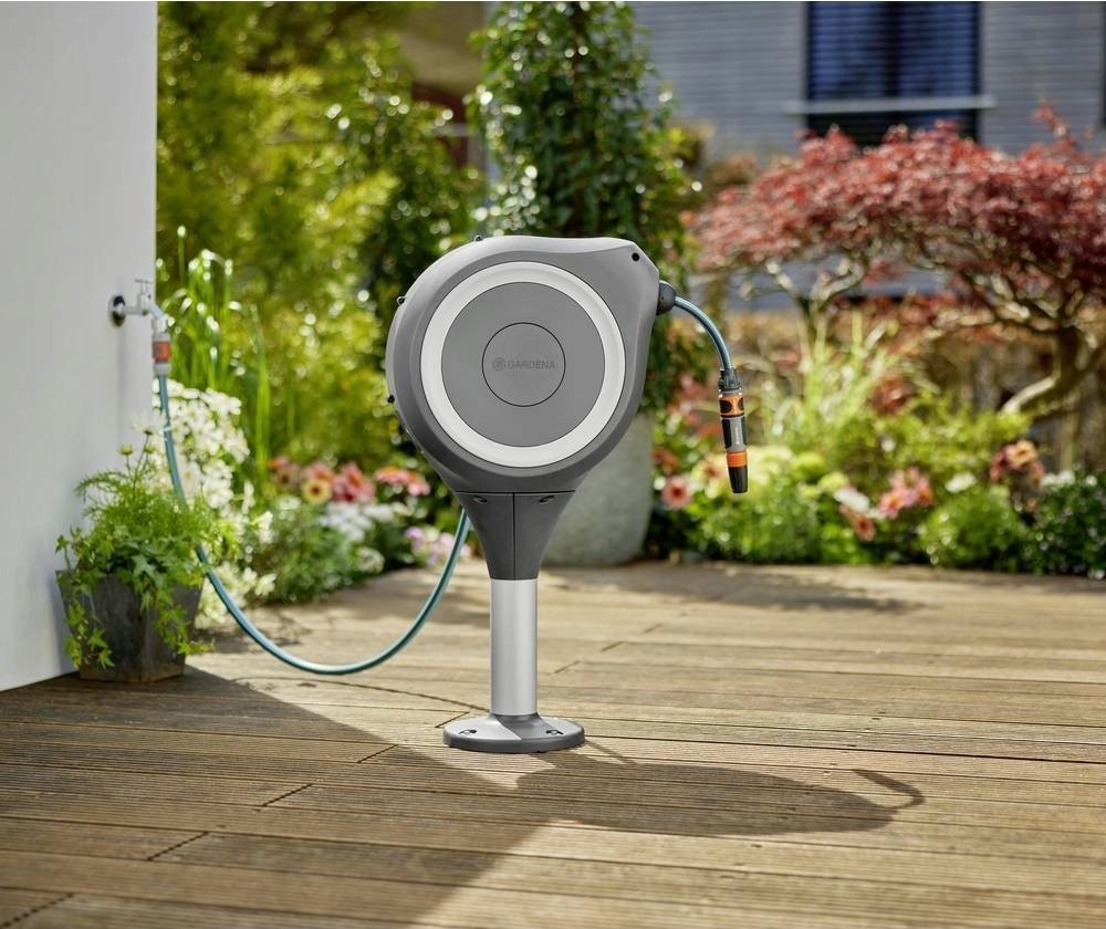 Der aufklappbare GARDENA RollUp M Terrassenschlauch mit automatischer Aufrollfunktion ist die ideale Lösung für mittelgroße Gärten und wird direkt auf der Terrasse montiert. Nach dem Gießen lässt sich die Arretierung durch leichtes Ziehen am Schlauchende lösen, wodurch die integrierte Stahlfeder aktiviert wird, die den Schlauch automatisch wieder aufrollt. Niemand muss mehr drehen, sich bücken oder sich die Hände schmutzig machen. Bewässerung mittelgroßer Gärten von der Terrasse aus Die Schlauchpistole lässt sich beliebig auf der Terrasse positionieren. Die universelle Halterung sorgt für einen festen und stabilen Halt auf Holz- und Betonflächen. Dank ihrer Flexibilität lässt sie sich um 360° drehen, sodass Sie jeden Winkel des Gartens erreichen können, ohne dass sich der Schlauch beim Drehen knickt. Dank des 20 m langen Schlauchs eignet sich die Pistole ideal zum Bewässern von Pflanzen in mittelgroßen Gärten. Einfaches Ausrollen dank RollControl Dank der integrierten Bremse sorgt die praktische RollControl-Technologie für ein langsames und kontrolliertes Ausrollen des Schlauchs mit Wasser und verhindert Beschädigungen. Die integrierte Schlauchführung ermöglicht zudem ein gleichmäßiges Aufrollen des Gartenschlauchs, ohne dass sich Knoten bilden oder der Schlauch verheddert. Das ganze Jahr über ist die Spritzpistole vor UV-Strahlung und Frost geschützt, wodurch sie besonders witterungsbeständig und jederzeit einsatzbereit ist. Im Winter muss die Box nicht abgebaut werden, sondern kann problemlos im Freien auf den nächsten Einsatz warten. GARDENA-Qualität, sofort einsatzbereit Die Gartenschlauchpistole enthält einen hochwertigen 20 m langen Schlauch, einen Anschlussschlauch und Original-GARDENA-Systemteile. Zusätzlich sind im Set Universalhalterungen sowie Schrauben und Dübel enthalten, sodass das in Europa hergestellte Produkt so schnell wie möglich einsatzbereit ist. Achtung!