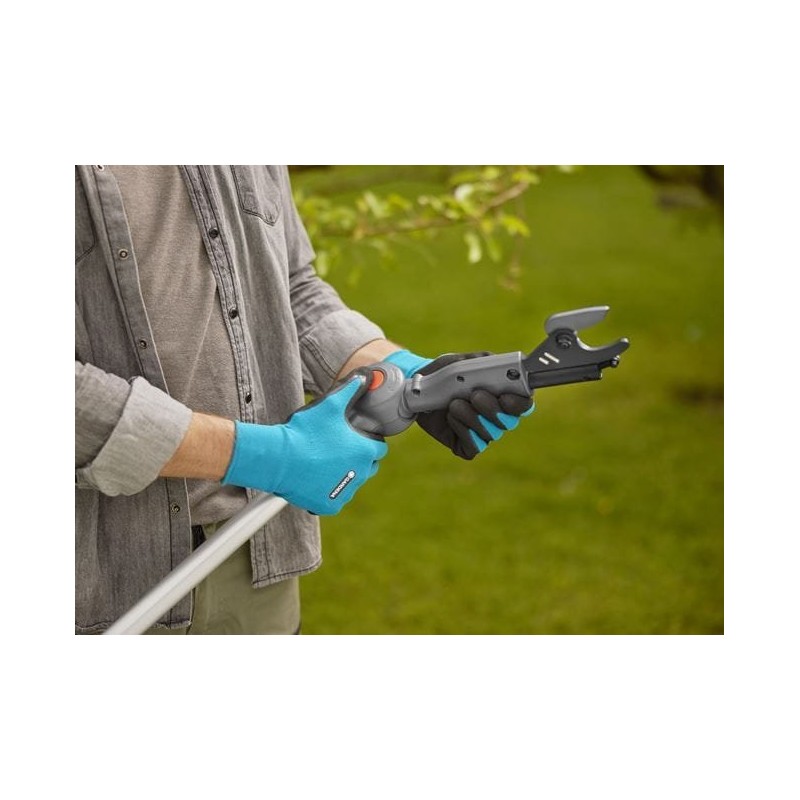 Der Kopf ermöglicht das Schneiden von Ästen in einem Winkel von 60 Grad. Die Klinge ist mit einer speziellen Beschichtung versehen, die das Anhaften von Schnittresten wirksam verhindert. Am Ende des Werkzeugs befindet sich ein Haken, der das Herunterziehen der abgeschnittenen Äste vom Baum erleichtert. Am Griff befindet sich eine LED-Anzeige, die über den Ladezustand des Akkus informiert. Ein voll aufgeladener Akku ermöglicht etwa 400 Schnitte. Lithium-Ionen-Akku mit 18 V Spannung.
