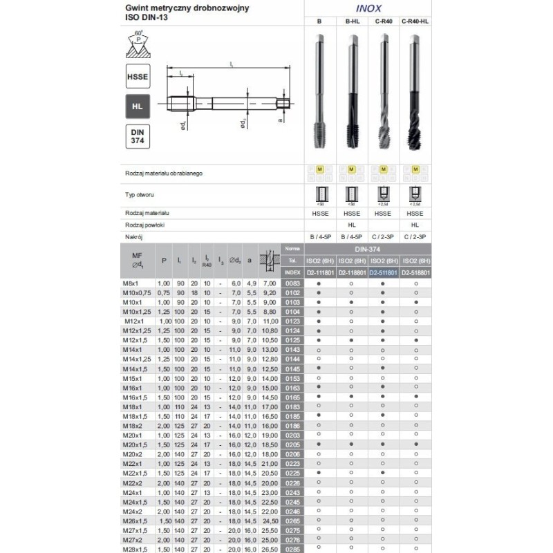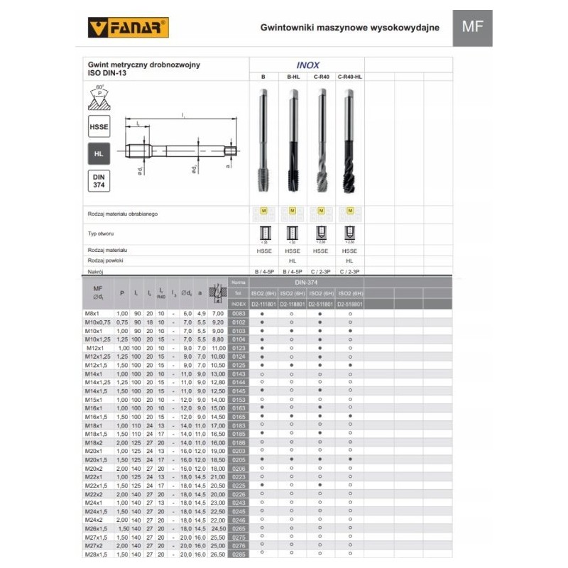 Technische Daten Fanar GEWINDBOHRER M14x1,5 DIN-374C R40 (6H) HSSE INOX