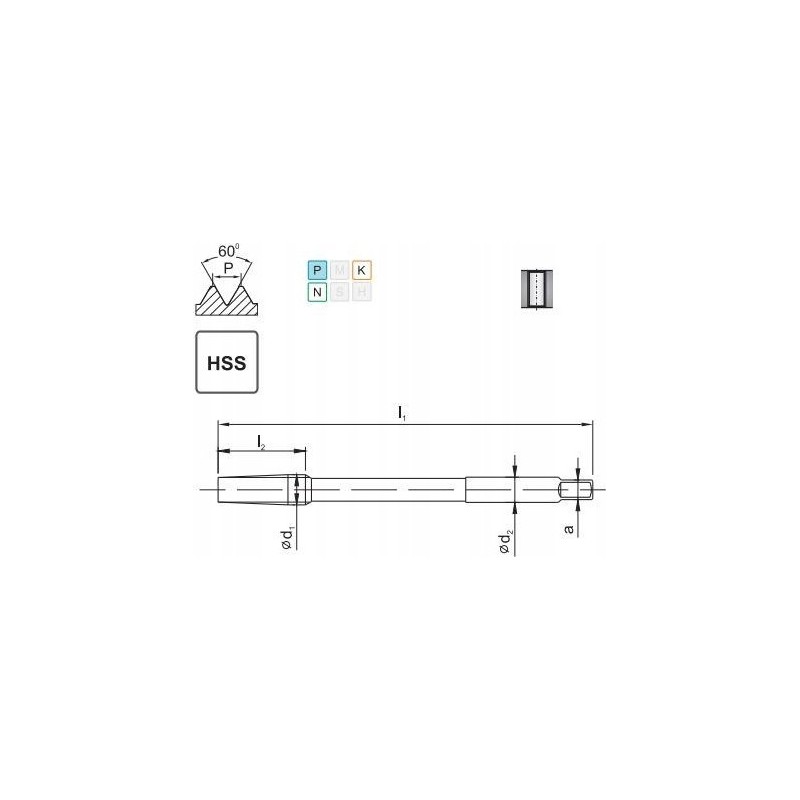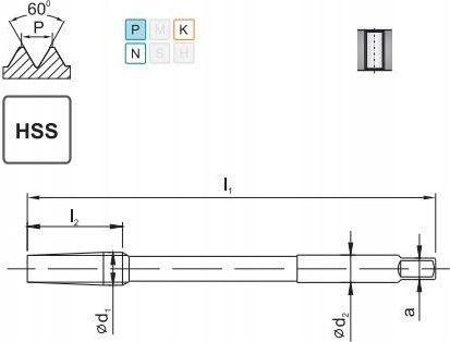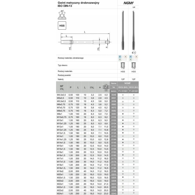 Der Maschinengewindebohrer NGMF mit metrischem Feingewinde ist für die Herstellung von Muttern vorgesehen, kann aber auch zur Herstellung tiefer Durchgangsbohrungen verwendet werden. Das Material, aus dem der Gewindebohrer gefertigt ist – hochleistungsfähiger Schnellarbeitsstahl – zeichnet sich durch eine hohe Verschleißfestigkeit aus. Die Behandlung im Vakuumofen gewährleistet eine hohe Härte des Werkzeugs bei gleichzeitig guter Zähigkeit. Der Gewindebohrer eignet sich ideal für die Bearbeitung von Automatenstahl, Baustahl, Aufkohlungsstahl, kohlenstoffhaltigem und niedriglegiertem Baustahl sowie Stahlguss.
