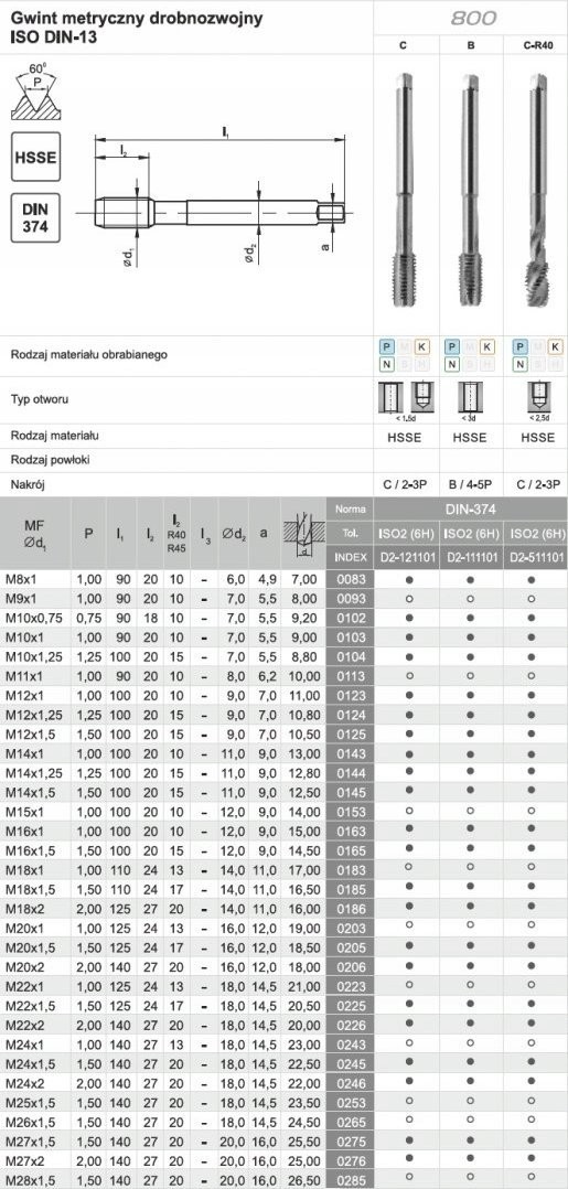 Eine Gruppe von Gewindebohrern mit einer Geometrie und Mikrogeometrie, die für die Bearbeitung von Kohlenstoffstählen, niedriglegierten Stählen mit einer Streckgrenze von bis zu 800 MPa sowie Aluminium ausgelegt ist. Das Werkzeugmaterial ist HSSE-Schnellarbeitsstahl mit einem Kobaltanteil von 5 %, der eine hohe Stabilität der Schneiden und eine effiziente Bearbeitung gewährleistet.