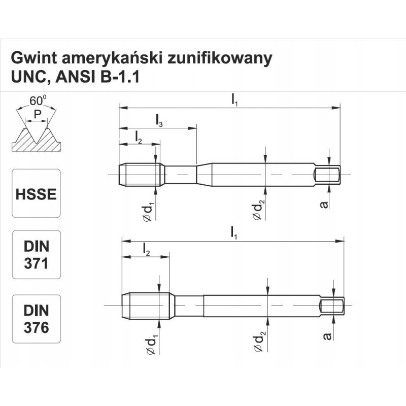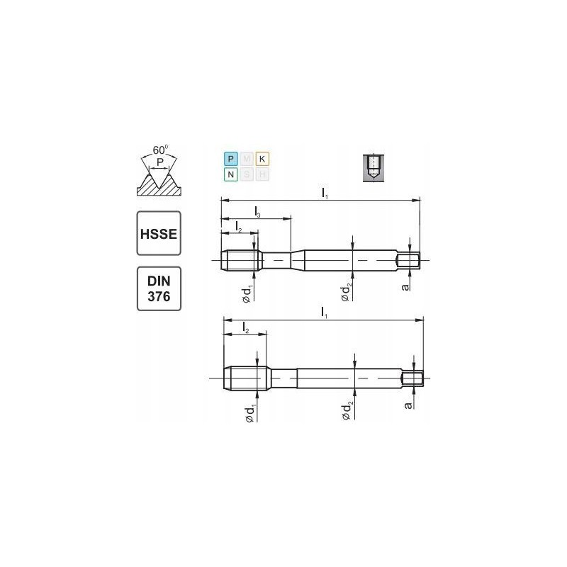 Kühlung – keine Toleranz des Teilungsdurchmessers – 2B Art der Spanrillen – R40 d1 – 19,050 P – 2,540 1"/P – 10 l1 – 125 l2 – 25 l3 - d2 - 14,0 a - 11,0 Durchmesser der Gewindebohrung - 16,50