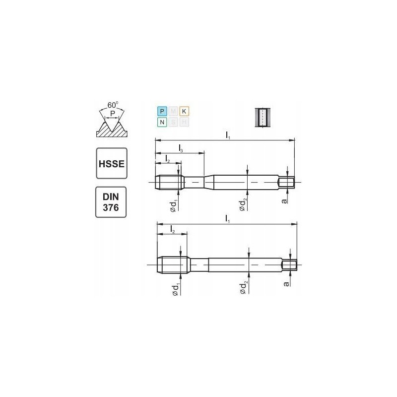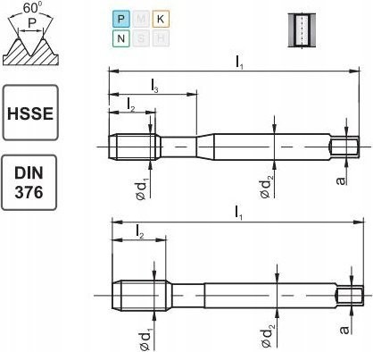 Kühlung – keine Toleranz des Teilungsdurchmessers – 2B Art der Spanrillen – Mit schräger Spanfläche d1 – 19,050 P – 2,540 1"/P – 10 l1 – 125 l2 – 32 l3 - d2 - 14,0 a - 11,0 Durchmesser der Gewindebohrung - 16,50