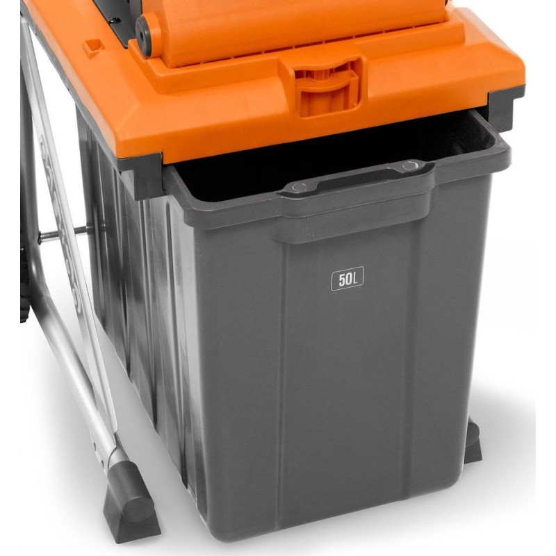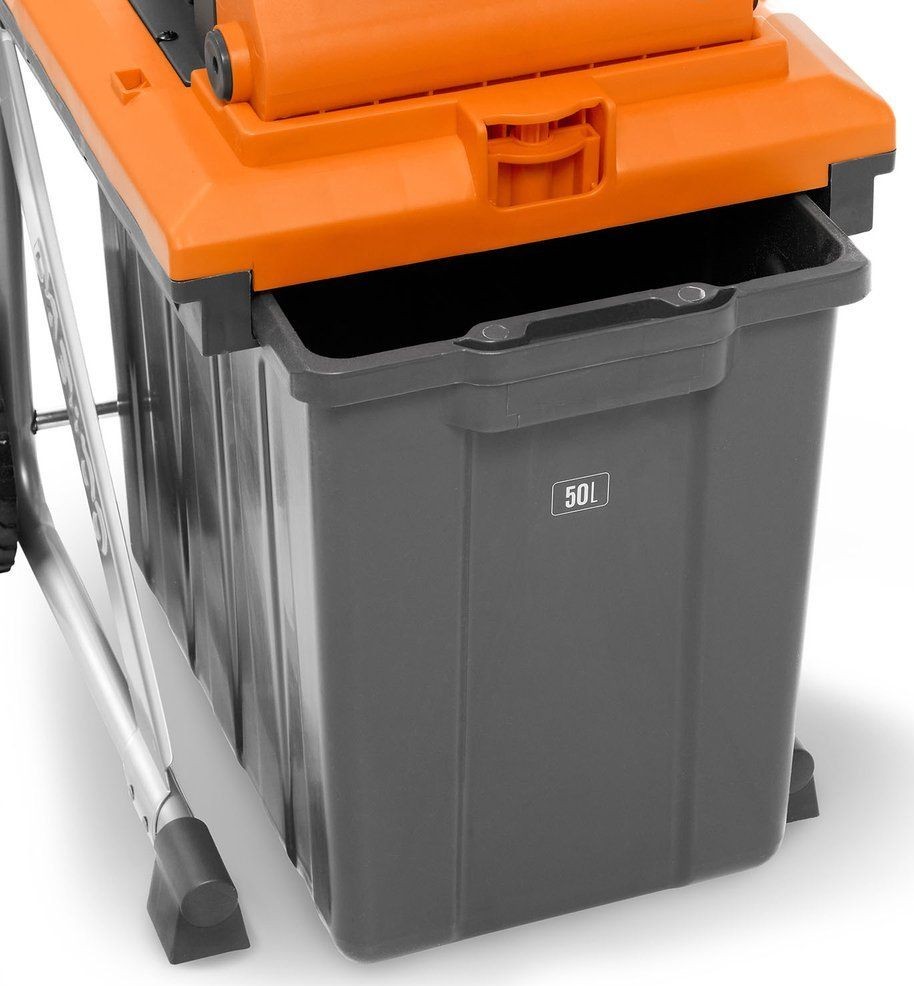 Einfach zu bedienen und zuverlässig im Betrieb. Ein Überlastschutz schont die Maschine vor Überhitzung und Beschädigung. Der aus robustem Kunststoff gefertigte, geräumige Auffangbehälter ermöglicht längeres Arbeiten, ohne dass häufige Pausen zum Entleeren erforderlich sind. Zwei Stahlmesser zerkleinern Äste mit einem Durchmesser von bis zu 40 mm zu feinem Hackschnitzel, das als wertvoller Kompostrohstoff oder Mulch für Pflanzen dienen kann.