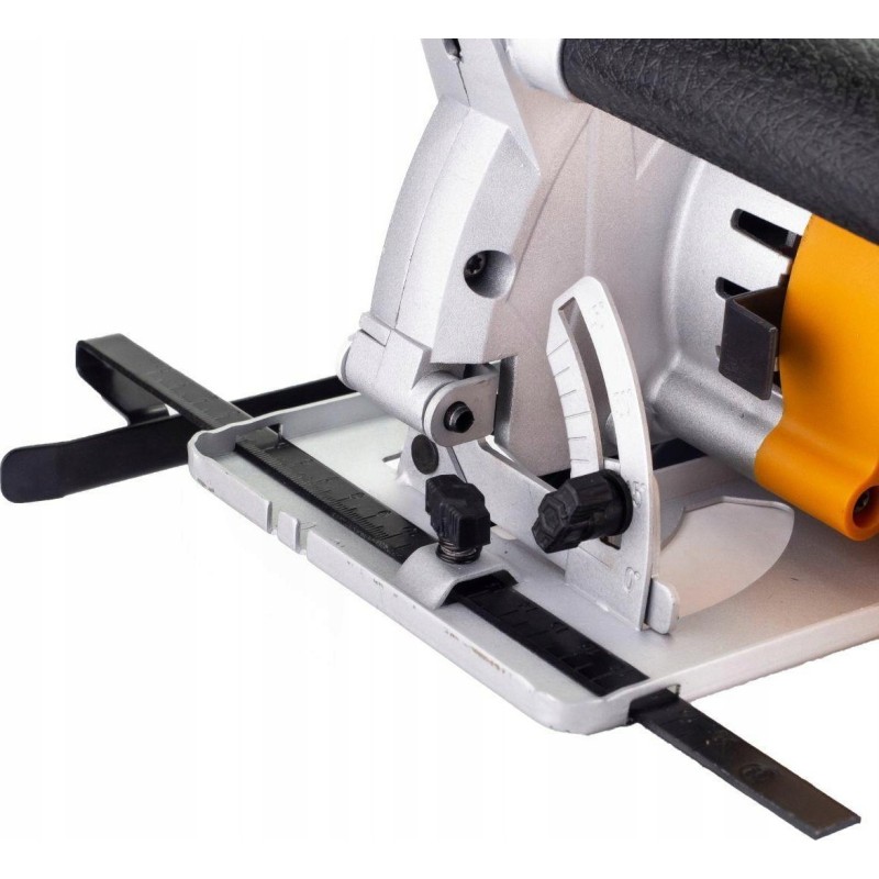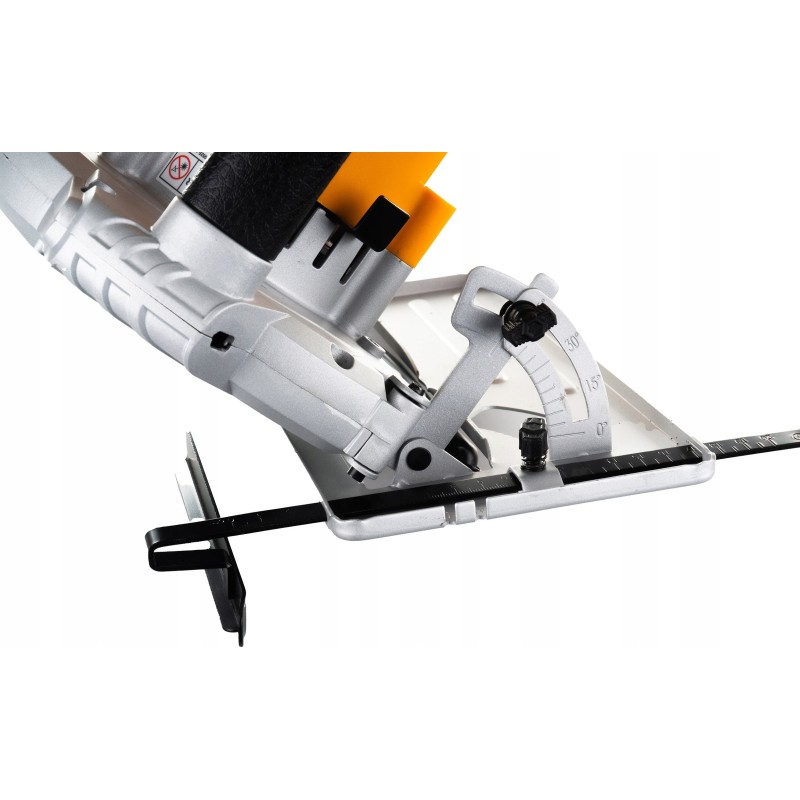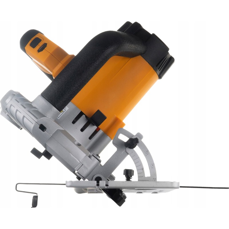 Die Säge verfügt über einen Metallfuß, der die Einstellung des Schnittwinkels (0–45°) sowie die Anpassung der Schnitttiefe an individuelle Anwendungen (0–65 mm) ermöglicht. Das Gerät verfügt über einen integrierten Laser, der die Schnittlinie anzeigt und so präzises Arbeiten ermöglicht. Der rutschfeste Griff sorgt für einen sicheren Halt und ermöglicht eine komfortable Handhabung.