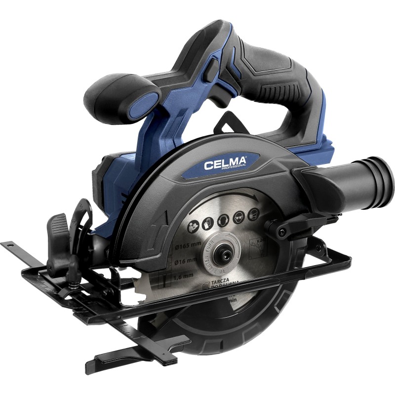 Die Akku-Kreissäge CELMA Professional DBRc-Li 18OBS gehört zur Serie von Werkzeugen, die mit einem einzigen 18-V-OBS-Akku (One Battery System) betrieben werden. Sie ist für geradlinige Schnitte in Massivholz, Tischlerplatten, Spanplatten, MDF und Sperrholz vorgesehen. Mit der Säge können auch furnierte und laminierte Möbelplatten geschnitten werden. Die Verwendung eines Sägeblatts mit einem Durchmesser von 165 mm ermöglicht Schnitte mit einer Tiefe von bis zu 54 mm bei einem Winkel von 90° und 35 mm bei einem Winkel von 45°. Die parallele Führung der Säge zur Kante des zu schneidenden Materials wird durch eine Führung gewährleistet, deren Ausladung einstellbar ist. Um den Benutzer vor mechanischen Verletzungen zu schützen, ist das Sägeblatt im oberen Bereich durch eine feste, mit dem Sägegehäuse verbundene Schutzhaube abgedeckt. Der untere Teil der Säge wird durch eine bewegliche Schutzhaube gesichert, die sich beim Schneiden unter dem Druck des zu bearbeitenden Materials zur Seite neigt. Der verwendete Schalter mit einer auf beiden Seiten des Hauptgriffs angebrachten Verriegelung erhöht die Sicherheit des Benutzers, indem er ein unbeabsichtigtes Einschalten verhindert. Die Säge ist zudem mit einer Sanftanlauf-Funktion, einer elektronischen Bremse und einem Überlastschutz ausgestattet. Der in der Sägeblattabdeckung befindliche Auswurfstutzen mit einem Durchmesser von 36 mm ermöglicht den Anschluss eines Staubsaugers an die Säge. Die Position des Auswurfschachts wurde so gewählt, dass möglichst viel des bei der Bearbeitung anfallenden Materials aufgefangen werden kann, wodurch Ordnung am Arbeitsplatz gewährleistet wird.