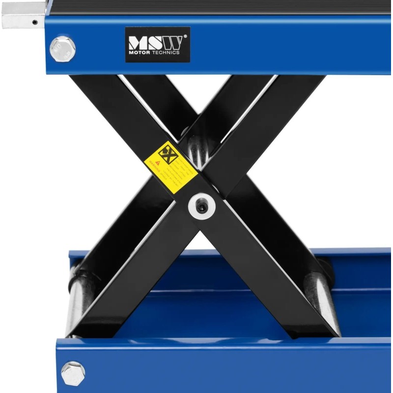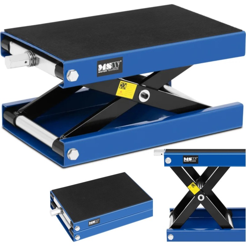 Herstellercode: 10062630Der mechanische Motorradheber der Marke MSW mit einer Tragkraft von bis zu 500 kg eignet sich besonders gut zum Anheben und Abstützen von Motorrädern, ATVs und Quads. Er hebt auch schwere Teile wie Getriebe oder Motoren mühelos auf eine bequeme Höhe, die ideal für Reparaturarbeiten ist. Der Heber erfüllt seinen Zweck in Motorrad-, Auto- und Servicewerkstätten sowie auf der Rennstrecke. Mit Hilfe des Hebers und unter Verwendung eines Schraubenschlüssels lässt sich das Motorrad Stück für Stück um bis zu 36 cm anheben. Das bedeutet, dass das Gerät sofort einsatzbereit ist und ohne Strom und Druckluft verwendet werden kann. Die Fläche der Hebeplattform beträgt 37 x 32 cm. Die gummierte Oberfläche schützt vor Kratzern und verhindert ein Verrutschen des Fahrzeugs. Dank der kompakten Bauweise des Hebers lässt sich das Gerät bequem an jedem beliebigen Ort einsetzen und transportieren. Um Unfälle und Verletzungen zu vermeiden, ist der Wagenheber mit einem Sicherungsstift ausgestattet, der zum Arretieren der gewählten Position dient. Der pulverbeschichtete Stahlrahmen sorgt für eine hohe Stabilität des Wagenhebers. Produktmerkmale:
