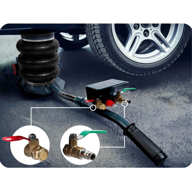 1. Grünes Ventil (Zufuhrventil) – lässt Druckluft einströmen und hebt den Wagenheber an.