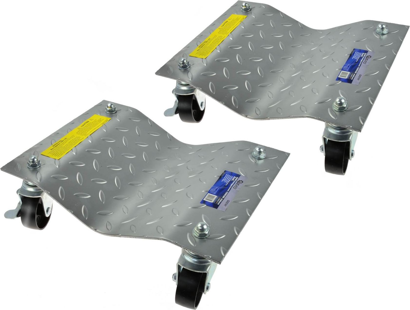 Set aus zwei Transportrollen für den Fahrzeugtransport. Jede Rolle hat eine maximale Tragkraft von 680 kg. Ideal geeignet für den Einsatz in professionellen Werkstätten und privaten Garagen. Produktmerkmale Plattformmaße 406 mm x 203 mm rutschfeste Plattformoberfläche 4 um 360° drehbare Rollen, davon 2 mit Feststellbremse 2 Stück im Set Technische Daten Tragkraft: 680 kg (1500 lbs) / Stück Raddurchmesser: 76 mm Höhe: 70 mm / 115 mm Länge: 406 mm (16") Breite: 302 mm (11-7/8") Anzahl der Teile im Set: 2 Material: Stahl Gewicht: 7,75 kg / Stück