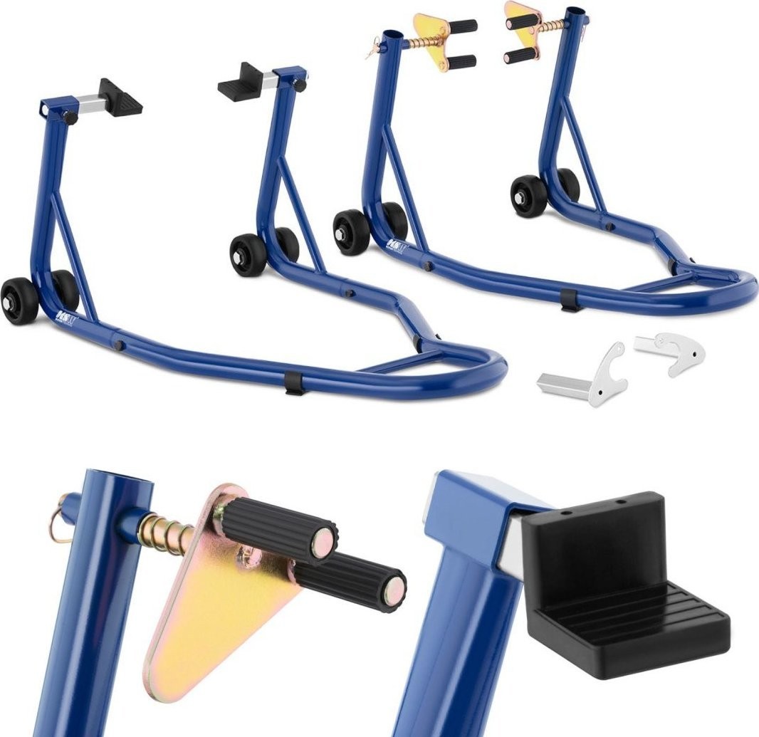 universelle Motorradständer der Marke MSW eignet sich ideal für Garagen, Werkstätten und alle Orte, an denen Motorräder abgestellt werden. Der Ständer passt für die meisten Motorräder und umfasst einen hinteren sowie einen vorderen Ständer. Diese sind mit den Adaptern B5, B6 und B3 ausgestattet. Die Handhabung der Ausrüstung ist sehr komfortabel. Dank des Ständers steht das abgestellte Fahrzeug sehr stabil und seine Reifen verformen sich nicht. Die Ständer können auch zum Anheben des Motorrads während der Reinigung oder Reparatur verwendet werden. Die Konstruktion besteht aus pulverbeschichtetem Kohlenstoffstahl.