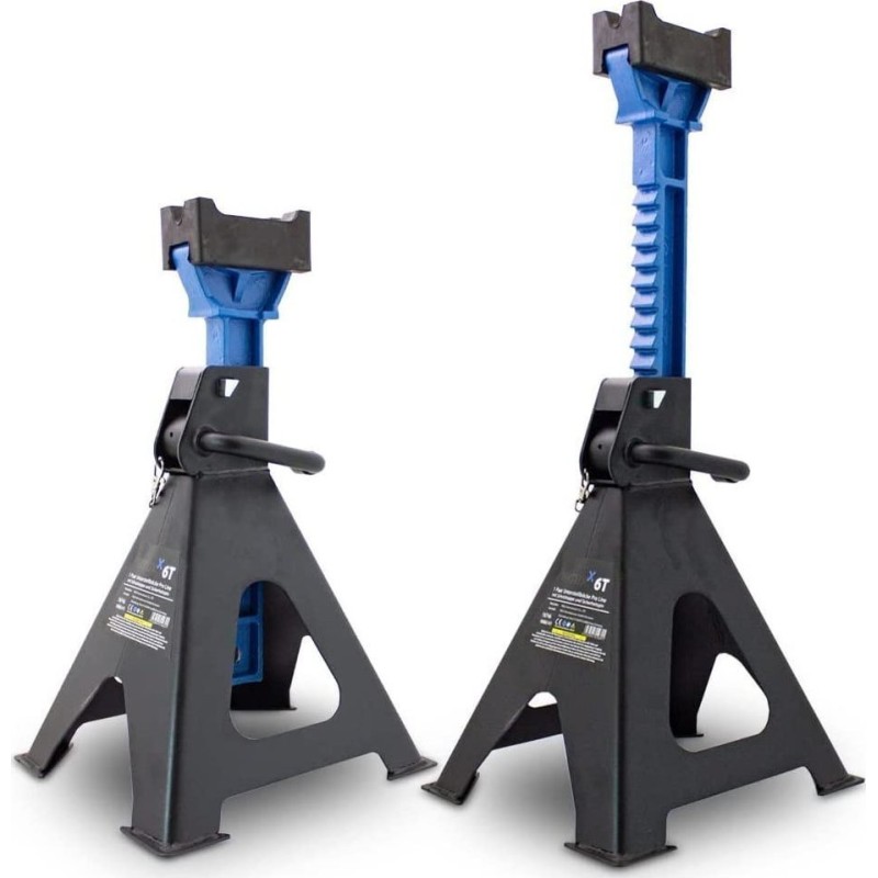 Die Werkstattstützen mit einer Tragkraft von 6 t/Stück passen in jede Kfz-Werkstatt oder Werkstatt. Die Böcke sind in 13 Stufen im Bereich von 39 bis ca. 60 cm höhenverstellbar. Gummiauflagen an den Griffen schützen die Ladung vor Beschädigungen. Große Standfüße sorgen für Stabilität auf harten Oberflächen.