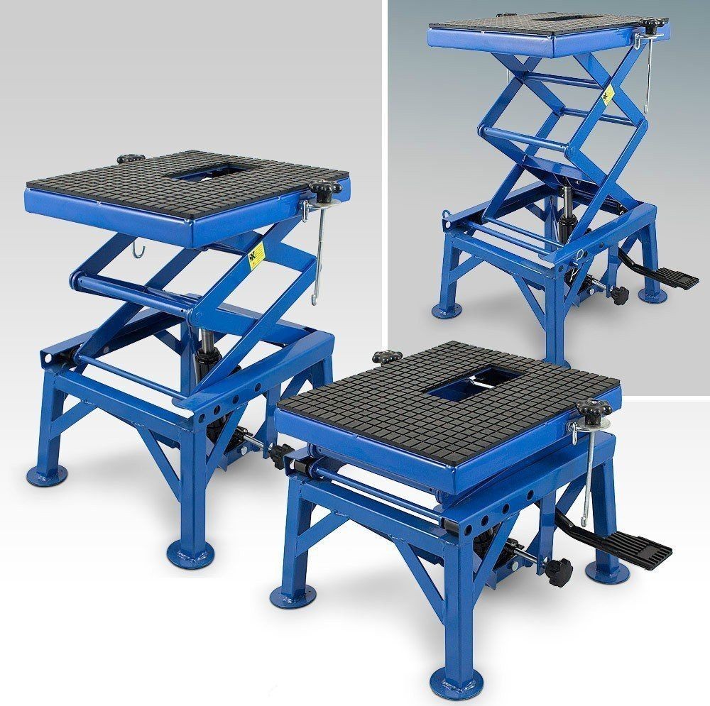 Scherenhebebühne für Motorräder und Quads. Ideal für Wartungs- und Reparaturarbeiten. Eignet sich sowohl für die Garage als auch für die professionelle Werkstatt. Der Heber verfügt über eine 3-stufige Höhenverstellung (60 cm, 75 cm und 87 cm), ein Pedal ermöglicht die Arretierung in der gewünschten Höhe. Die Plattform ist mit Gummi gepolstert, was für einen stabilen Stand des angehobenen Objekts sorgt.